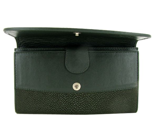 Well made; brand new ladies Stingray Hide dark green clutch purse/wallet. 7.5" x 4" x 1" when folded. Multiple inside sections; one zippered with multiple dividers and a smaller zippered section inside and one with multiple bill and card dividers
