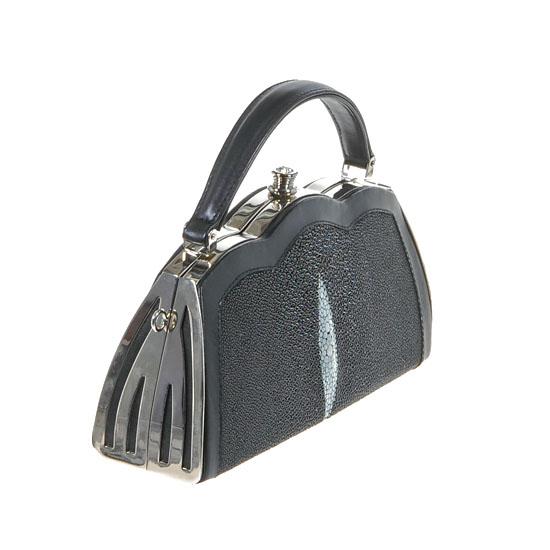 Well made; brand new ladies Stingray Hide black purse with stainless adornments. 9.5" x 7" x 3" when closed. Three inside sections; one zippered; with shoulder strap. A truly unique accoutrement! $995 retail.