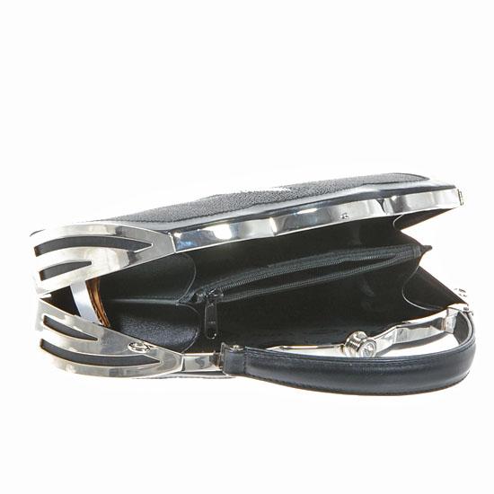 Well made; brand new ladies Stingray Hide black purse with stainless adornments. 9.5" x 7" x 3" when closed. Three inside sections; one zippered; with shoulder strap. A truly unique accoutrement! $995 retail.