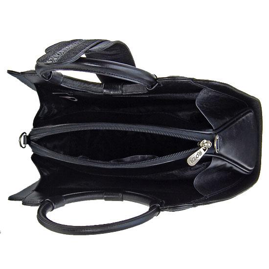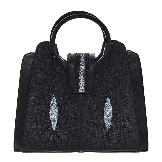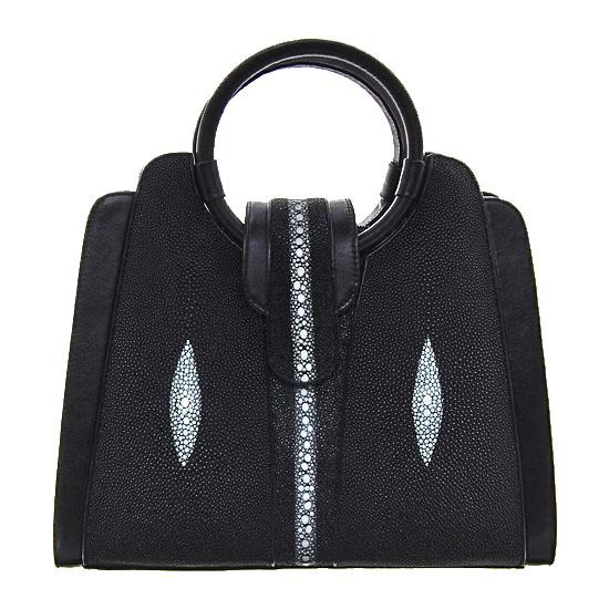 Well made from 6 separate skins; brand new ladies Stingray Hide black purse. 12" x 12" x 4" when closed. Four inside sections; two zippered; with protective storage bag. A truly unique accoutrement! $1595 retail.