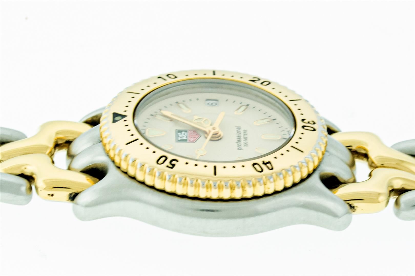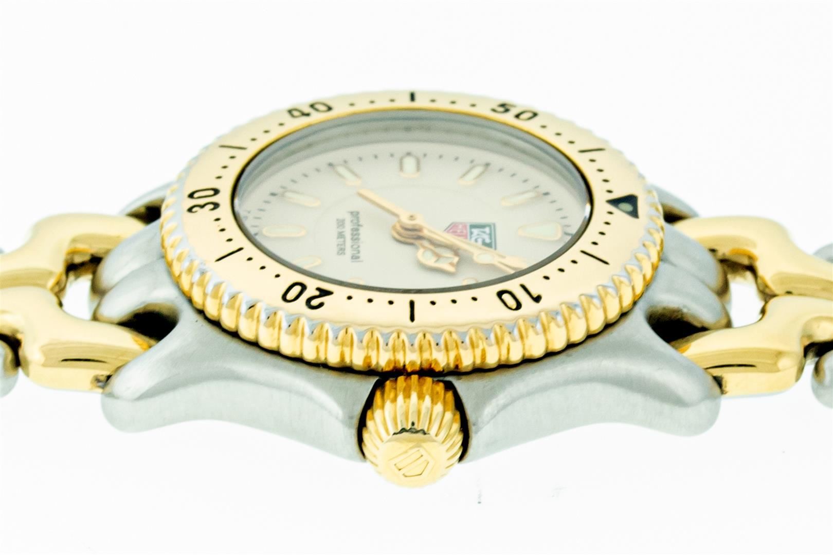 One Ladies Tag Heuer 200 Meters Professional Stainless Steel & Gold Plated Polished Bright, This Watch Has Brand New Battery & Has Been Electronically Tested, Stainless Steel and gold plated Case: 24mm, Gold Plated Crown, Bezel: Gold Plated Rotating Tag Heuer Bezel, Crystal: Sapphire Crystal, Hands: Yellow Hands, Movement: Battery Operated Tag Heuer Quartz Movement, Dial: Tag Heuer Beige Dial With Index Hour Markers, Model: Tag Heuer 200 Professional. Condition: G-6 Extra Fine. Bracelet: Tag Heuer Two Tone Gold Plated And Stainless Steel Bracelet. Bright Polish. Fits Up To 5.75 Inch Wrist, Folding Stainless Steel Clasp, This Watch Has Time Tested And Is In Excellent Condition. It Is Free Of All Scratches And Dents. It comes with the Original Warrany Papers.