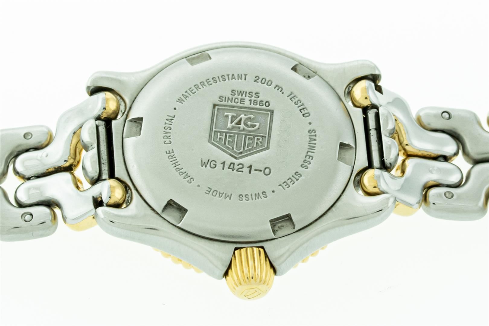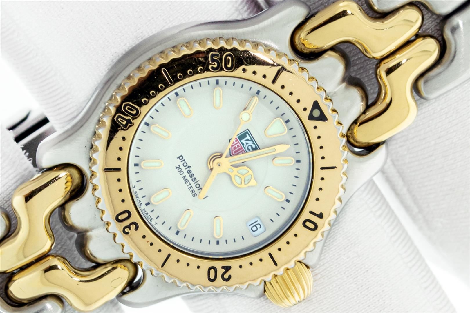 One Ladies Tag Heuer 200 Meters Professional Stainless Steel & Gold Plated Polished Bright, This Watch Has Brand New Battery & Has Been Electronically Tested, Stainless Steel and gold plated Case: 24mm, Gold Plated Crown, Bezel: Gold Plated Rotating Tag Heuer Bezel, Crystal: Sapphire Crystal, Hands: Yellow Hands, Movement: Battery Operated Tag Heuer Quartz Movement, Dial: Tag Heuer Beige Dial With Index Hour Markers, Model: Tag Heuer 200 Professional. Condition: G-6 Extra Fine. Bracelet: Tag Heuer Two Tone Gold Plated And Stainless Steel Bracelet. Bright Polish. Fits Up To 5.75 Inch Wrist, Folding Stainless Steel Clasp, This Watch Has Time Tested And Is In Excellent Condition. It Is Free Of All Scratches And Dents. It comes with the Original Warrany Papers.