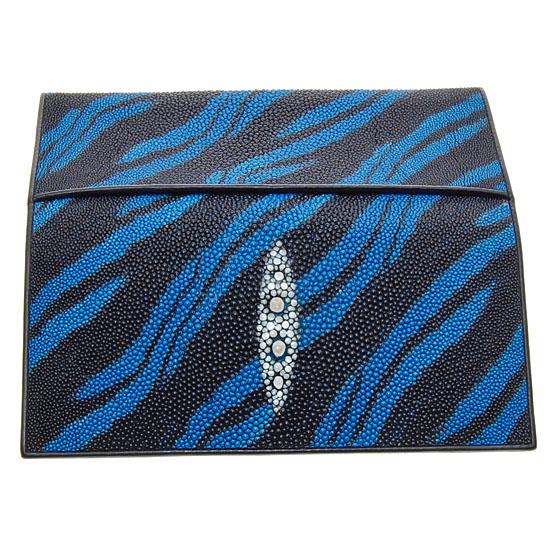 Well made; brand new ladies blue/black tiger print Stingray Hide wallet. 7.5" x 3.5" when folded; multiple bill; card and one zippered section inside. A truly collectible accoutrement! $395 retail.