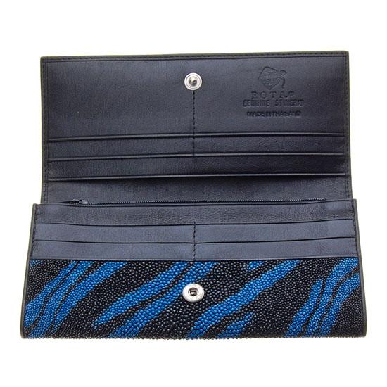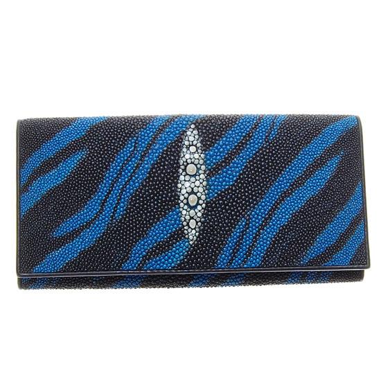 Well made; brand new ladies blue/black tiger print Stingray Hide wallet. 7.5" x 3.5" when folded; multiple bill; card and one zippered section inside. A truly collectible accoutrement! $395 retail.