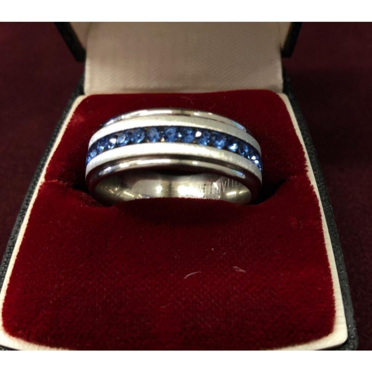 Ladies Titanium Steel Silver Brushed Blue Rhinestone Engagement Ring. Brand New, Size 10. This Ring Is An Obvious Staple For Your Special Day! Decorated In Luxurious Blue Rhinestones, She Will Never Get Tired Of Looking At It! And It Can Count As Her "Something Blue".  See Photos for Further Inquiry.Â
