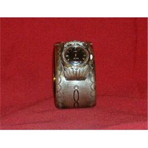 This is an unique bangle watch band. It is in excellent shape. There is a Timex watch face in the slot but it doesn't appear to be working. It may just need a battery. The stone setting on the bangle is very unique. The etching in the silver band is another unique feature that this wonderful piece has. There is an engraving on the underside that is a :M over the top of a W or vise versa. I'm not really sure what it stands for, but it is believed to be Indian made.