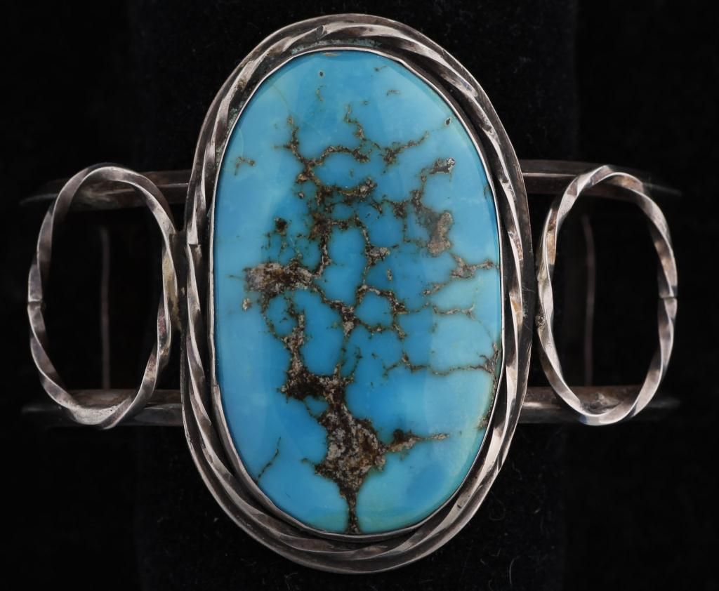 Ladies Turquoise Cuff BraceletBrilliant turquoise with silver matrix in stone, set in sterling silver.
