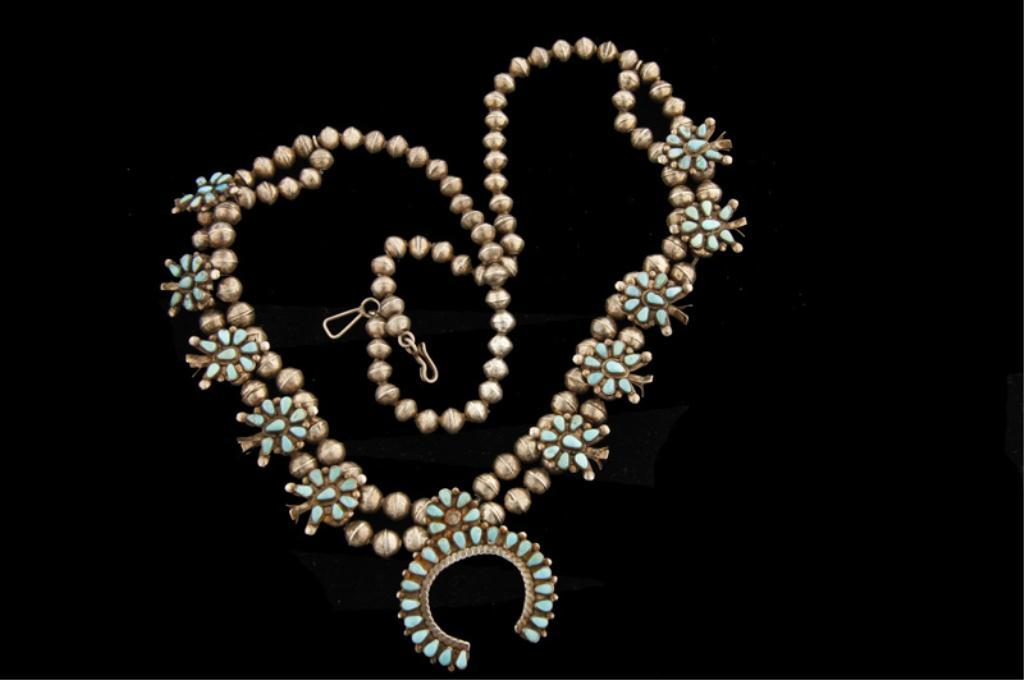 Ladies Turquoise and Silver Squash Blossom Measures 13 1/2", signed "AI".Measures 13 1/2", signed "AI".