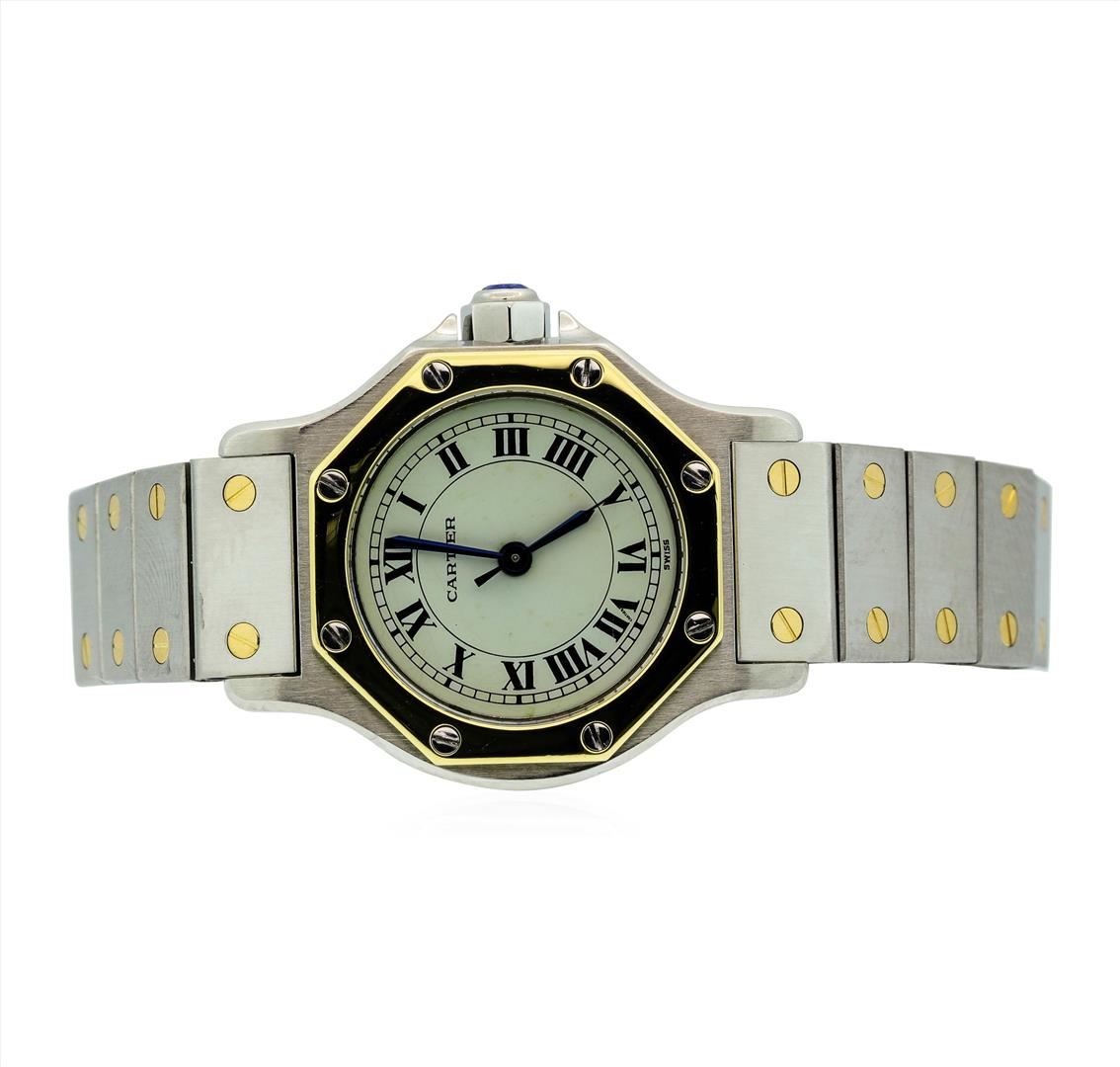 Ladies Two Tone Stainless Steel & 18K Gold Cartier Santos Automatic Watch. This watch is in excellent condition. The watch has the following attributes: Case: Octagon Shaped Stainless Steel 27mm case marked with "Cartier, AC 9,80 gr OR 0,750 2,30 gr, Automatique", Bezel: Octagon shaped bezel in Solid 18K Yellow Gold, Crown: Stainless Steel with Faceted Blue Sapphire insert, Dial: Original factory white dial with black roman numeral markers, Bracelet: Stainless Steel with 18K Yellow Gold Screws with deployable clasp signed "Cartier", Movement: Cartier Self Winding 25 Jewel Movement.