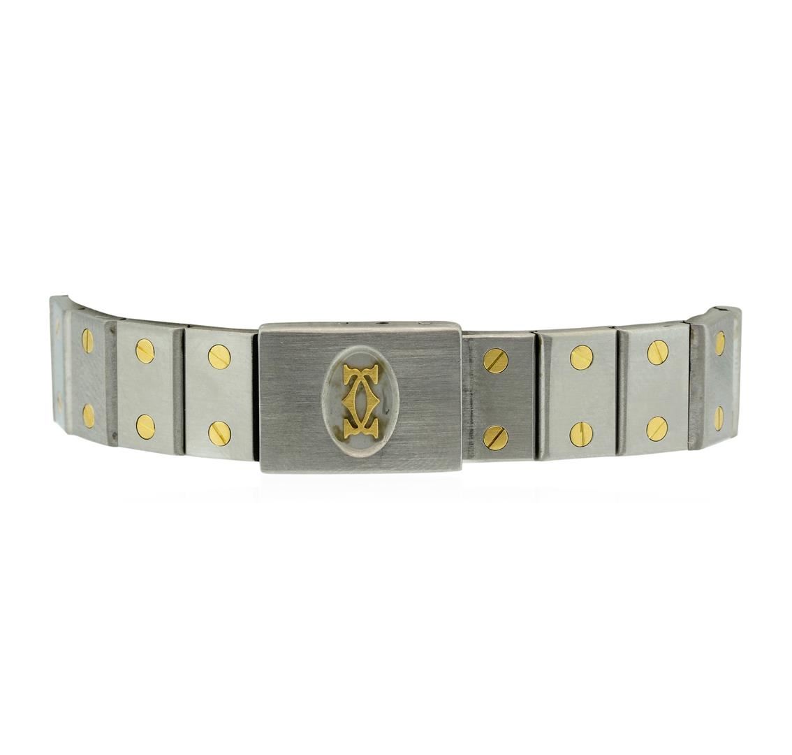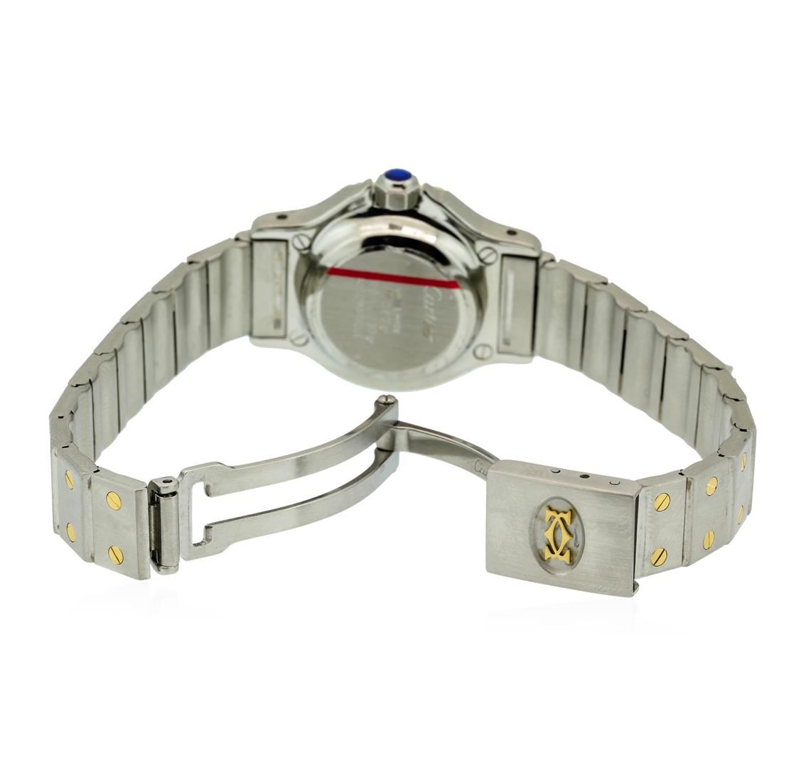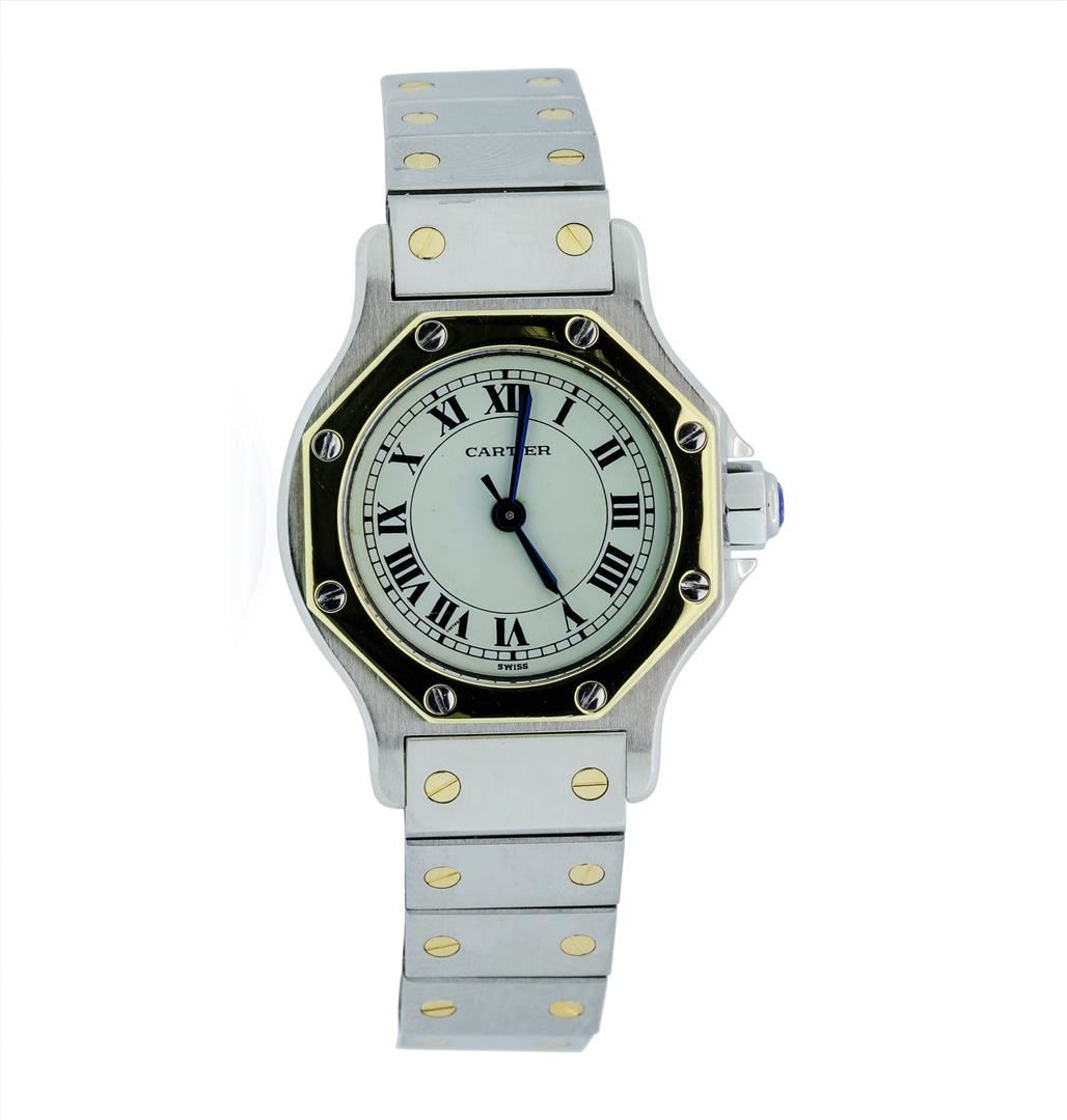 Ladies Two Tone Stainless Steel & 18K Gold Cartier Santos Automatic Watch. This watch is in excellent condition. The watch has the following attributes: Case: Octagon Shaped Stainless Steel 27mm case marked with "Cartier, AC 9,80 gr OR 0,750 2,30 gr, Automatique", Bezel: Octagon shaped bezel in Solid 18K Yellow Gold, Crown: Stainless Steel with Faceted Blue Sapphire insert, Dial: Original factory white dial with black roman numeral markers, Bracelet: Stainless Steel with 18K Yellow Gold Screws with deployable clasp signed "Cartier", Movement: Cartier Self Winding 25 Jewel Movement.