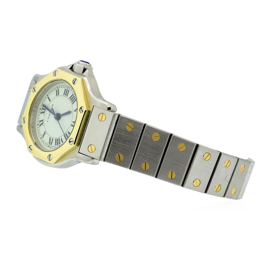 Ladies Two Tone Stainless Steel & 18K Gold Cartier Santos Automatic Watch. This watch is in excellent condition. The watch has the following attributes: Case: Octagon Shaped Stainless Steel 27mm case marked with "Cartier, AC 9,80 gr OR 0,750 2,30 gr, Automatique", Bezel: Octagon shaped bezel in Solid 18K Yellow Gold, Crown: Stainless Steel with Faceted Blue Sapphire insert, Dial: Original factory white dial with black roman numeral markers, Bracelet: Stainless Steel with 18K Yellow Gold Screws with deployable clasp signed "Cartier", Movement: Cartier Self Winding 25 Jewel Movement.