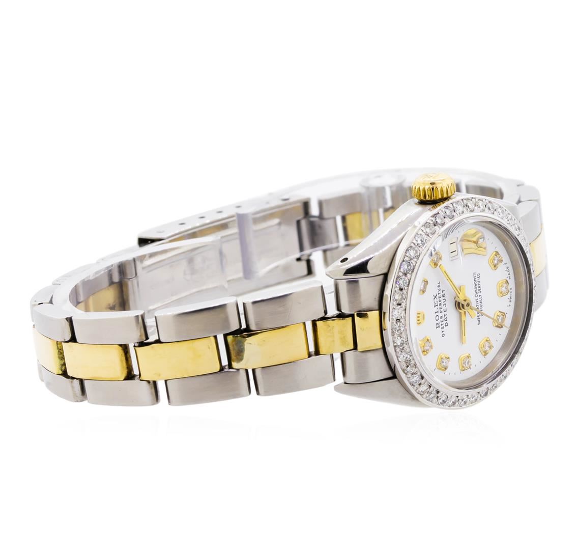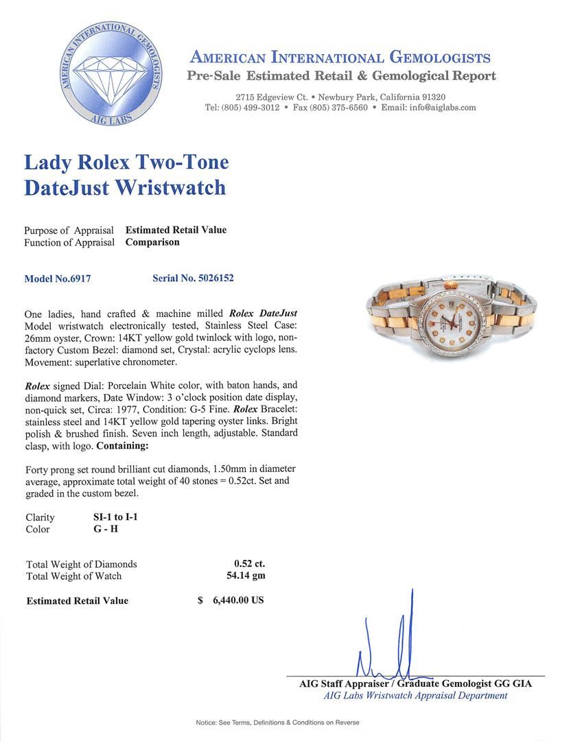 One ladies, hand crafted & machine milled Rolex DateJust Model wristwatch electronically tested, Stainless Steel Case: 26mm oyster, Crown: 14KT yellow gold twinlock with logo, non-factory Custom Bezel: diamond set, Crystal: acrylic cyclops lens. Movement: superlative chronometer. Rolex signed Dial: Porcelain White color, with baton hands, and diamond markers, Date Window: 3 o'clock position date display, non-quick set, Circa: 1977, Condition: G-5 Fine. Rolex Bracelet: stainless steel and 14KT yellow gold tapering oyster links. Bright polish & brushed finish. Seven inch length, adjustable. Standard clasp, with logo. Containing: Forty prong set round brilliant cut diamonds, 1.50mm in diameter average, approximate total weight of 40 stones = 0.52ct. Set and graded in the custom bezel. Clarity: SI-1 to I-1. Color: G - H. Total Weight of Diamonds 0.52ct. Total Weight of Watch 54.14gm. AIG Appraised at $6,440.00.