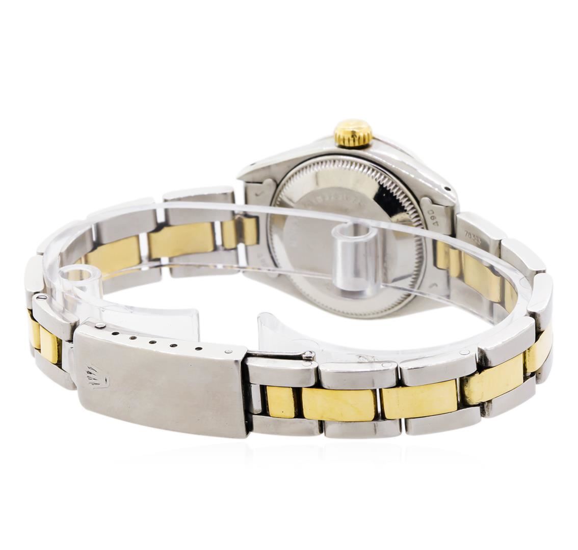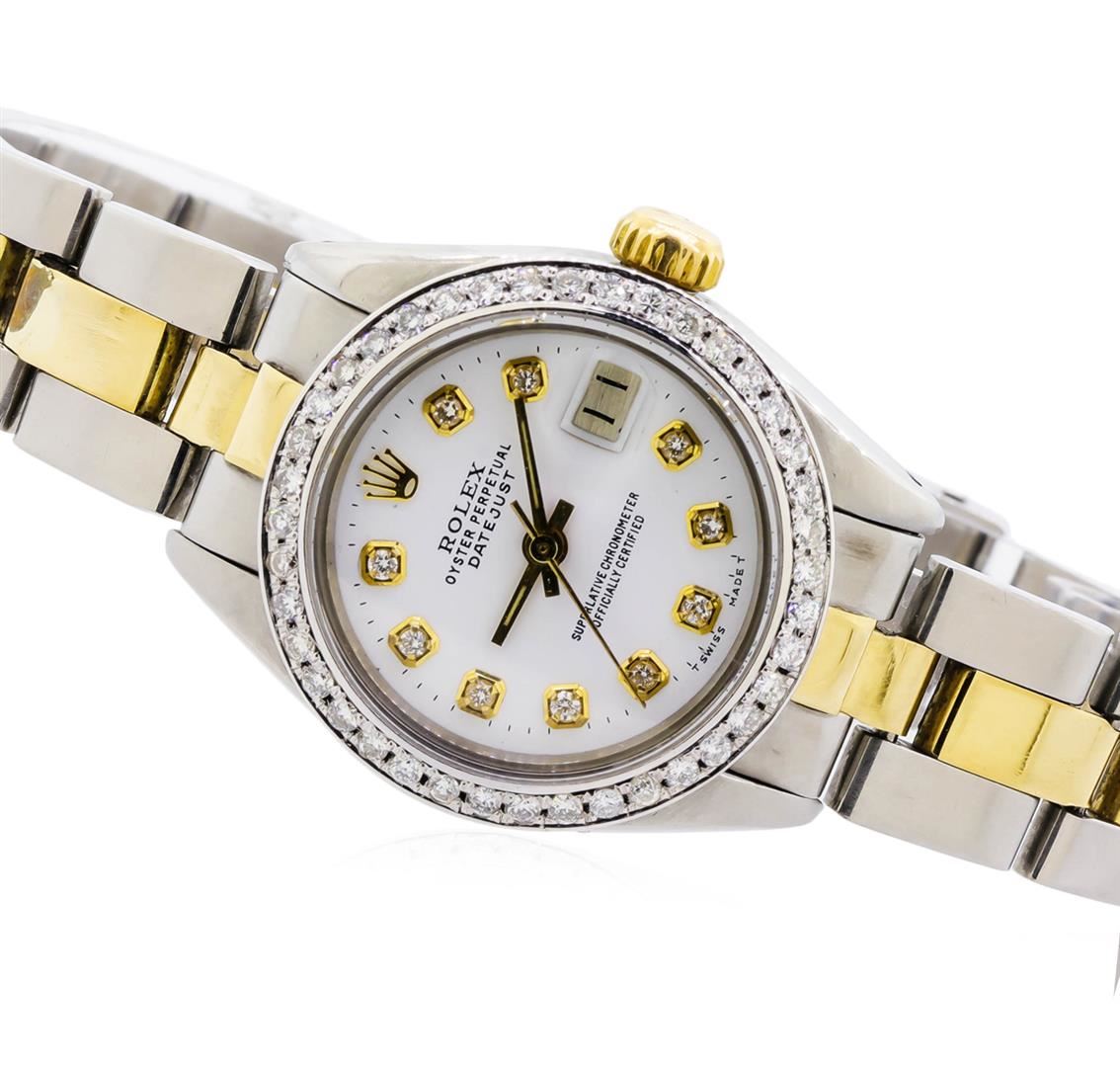 One ladies, hand crafted & machine milled Rolex DateJust Model wristwatch electronically tested, Stainless Steel Case: 26mm oyster, Crown: 14KT yellow gold twinlock with logo, Custom Bezel: diamond set, Crystal: acrylic cyclops lens. Movement: superlative chronometer. Rolex signed Dial: Porcelain White color, with baton hands, and diamond markers, Date Window: 3 o'clock position date display, non-quick set, Circa: 1977, Condition: G-5 Fine. Rolex Bracelet: stainless steel and 14KT yellow gold tapering oyster links. Bright polish & brushed finish. Seven inch length, adjustable. Standard clasp, with logo. Containing: Forty prong set round brilliant cut diamonds, 1.50mm in diameter average, approximate total weight of 40 stones = 0.52ct. Set and graded in the custom bezel. Clarity: SI-1 to I-1. Color: G - H. Total Weight of Diamonds 0.52ct. Total Weight of Watch 54.14gm. AIG Appraised.