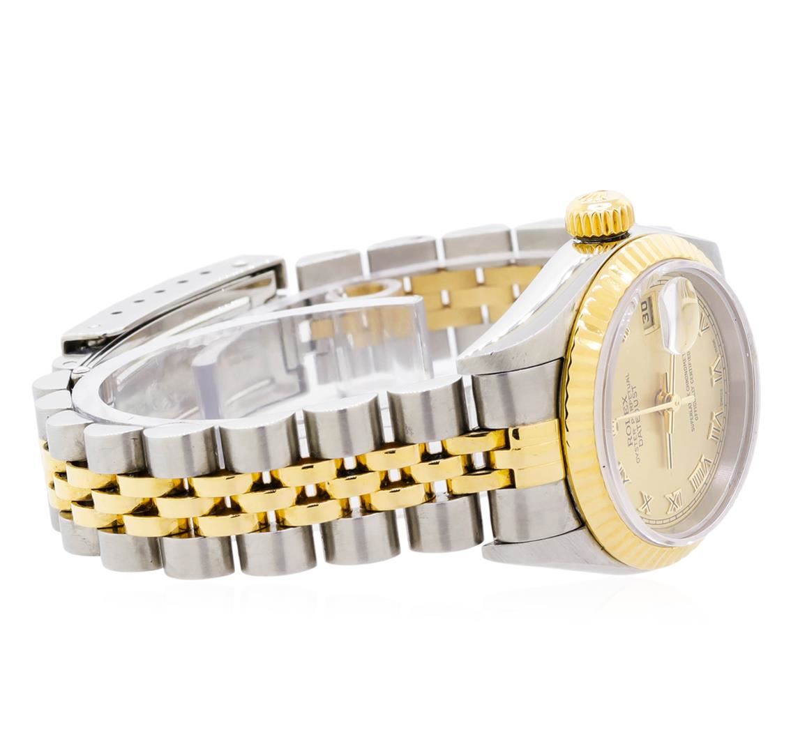 One ladies, hand crafted & machine milled Rolex DateJust Model wristwatch electronically tested, stainless steel Case: 26mm oyster, 18KT yellow gold Crown: twinlock with logo, 18KT yellow gold Bezel: fluted, Crystal: synthetic sapphire cyclops lens. Circa: 2000.Movement: superlative chronometer, Rolex signed Dial: Champagne color, with baton hands & raised Roman numerals, Calendar: 3 o'clock position date display, quick set, Condition: G-6 Extra Fine, Rolex Bracelet: stainless steel and 18KT yellow gold jubilee links. Six inch length, adjustable. Standard clasp, with logo. Total Weight of Watch 53.96gm This watch comes complete with original box and papers. AIG Appraised at $7,150.00.