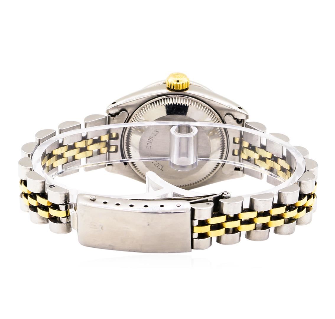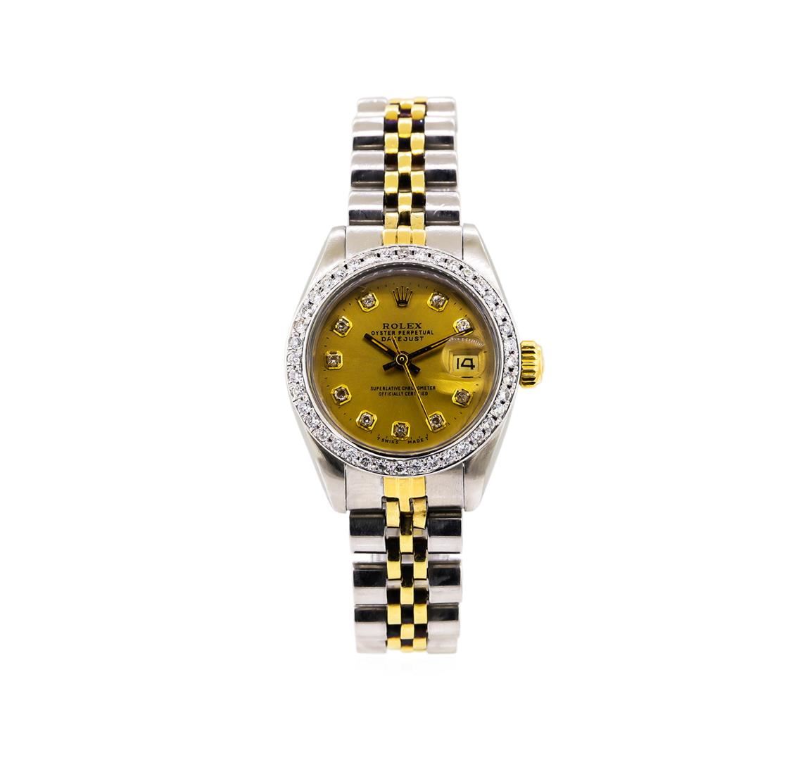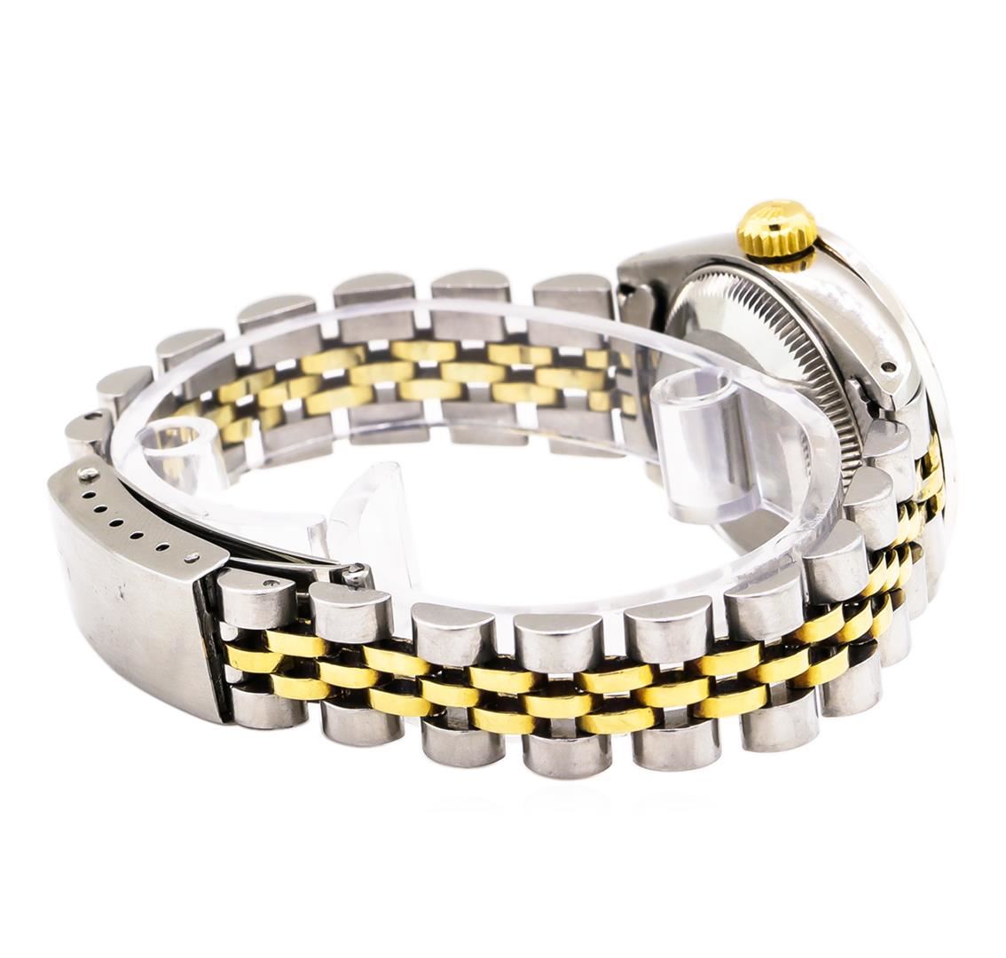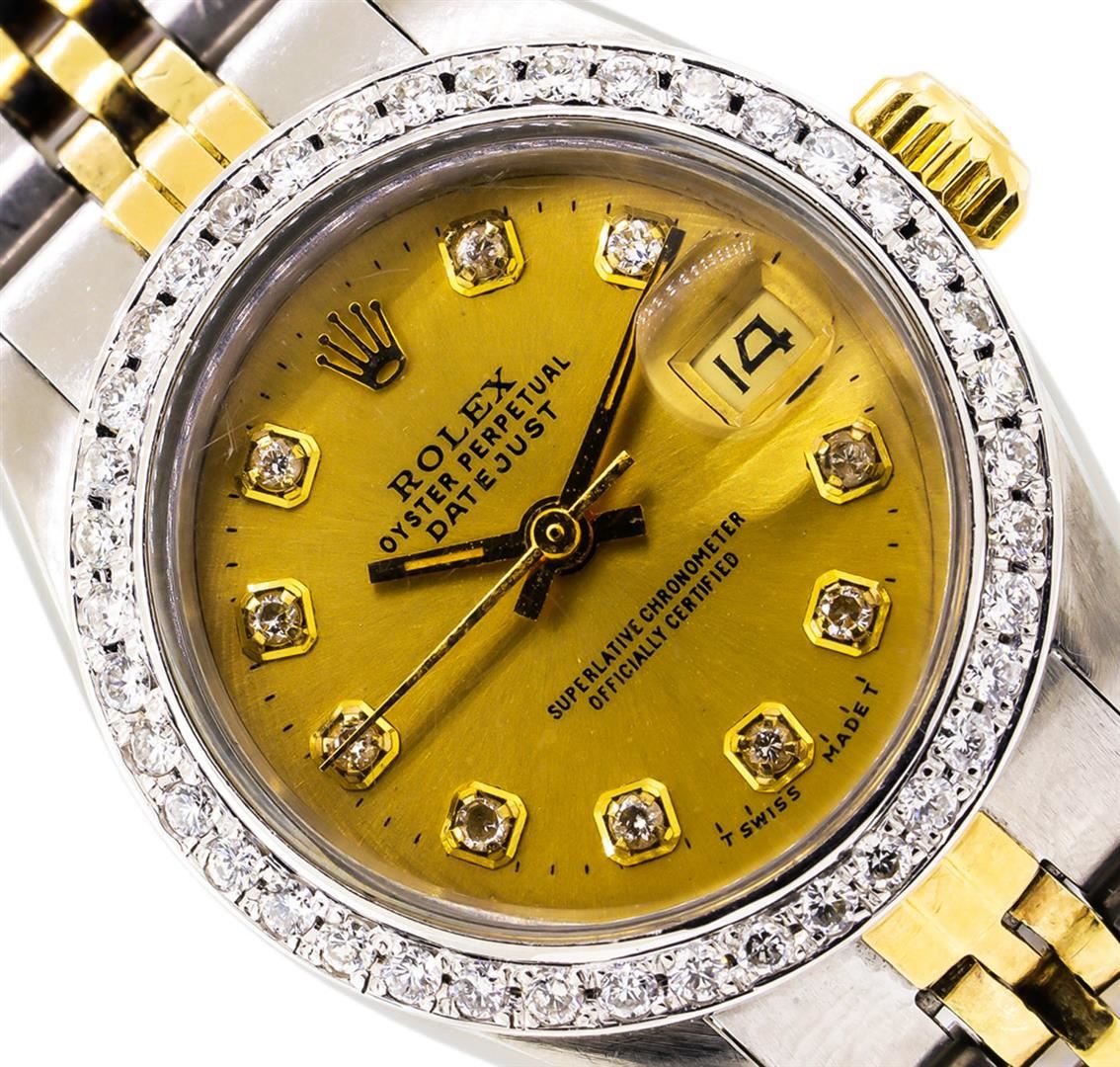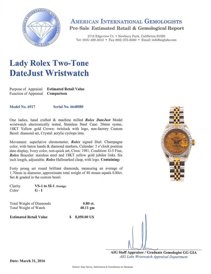 One ladies, hand crafted & machine milled Rolex DateJust Model wristwatch electronically tested, Stainless Steel Case: 26mm oyster, 18KT Yellow gold Crown: twinlock with logo, non-factory Custom Bezel: diamond set, Crystal: acrylic cyclops lens. Movement: AIG Appraised at $8,050.00.