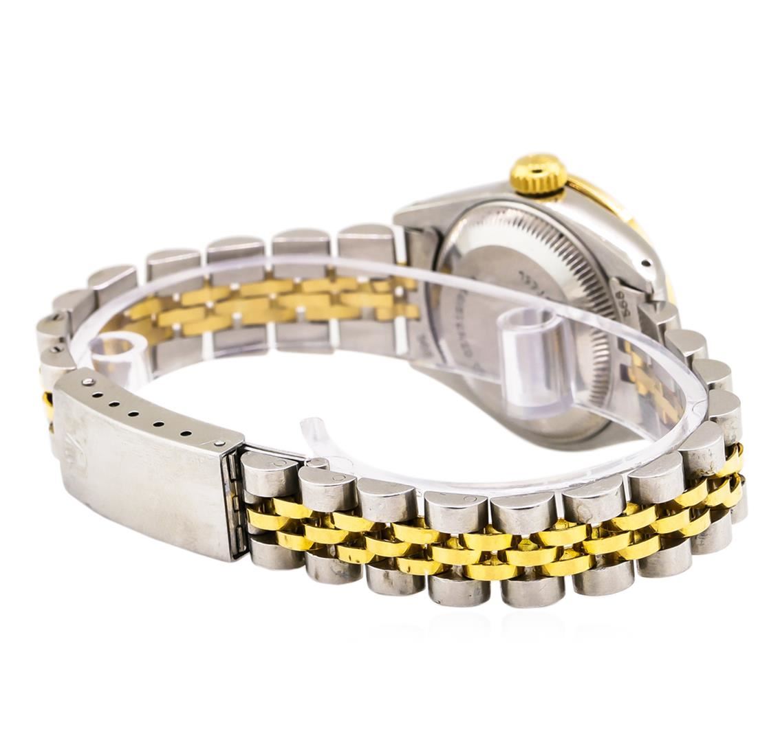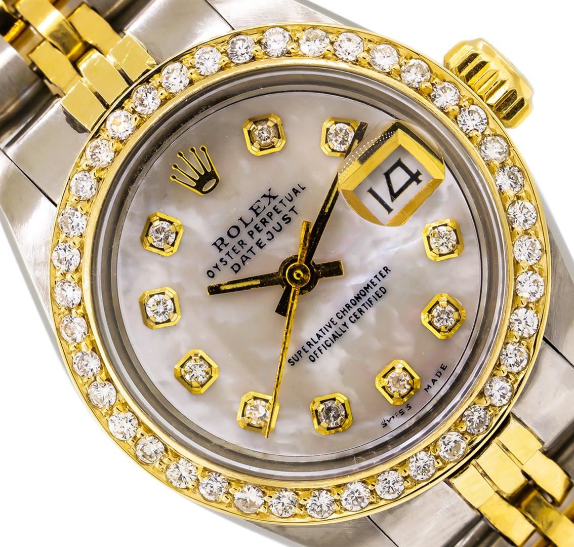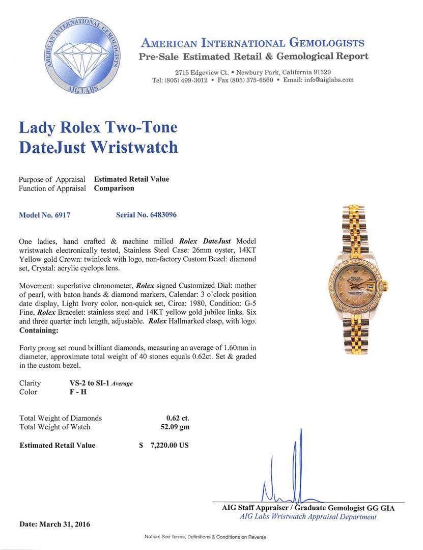 One ladies, hand crafted & machine milled Rolex DateJust Model wristwatch electronically tested, Stainless Steel Case: 26mm oyster, 14KT Yellow gold Crown: twinlock with logo, non-factory Custom Bezel: diamond set, Crystal: acrylic cyclops lens. Movement: AIG Appraised at $7,220.00.