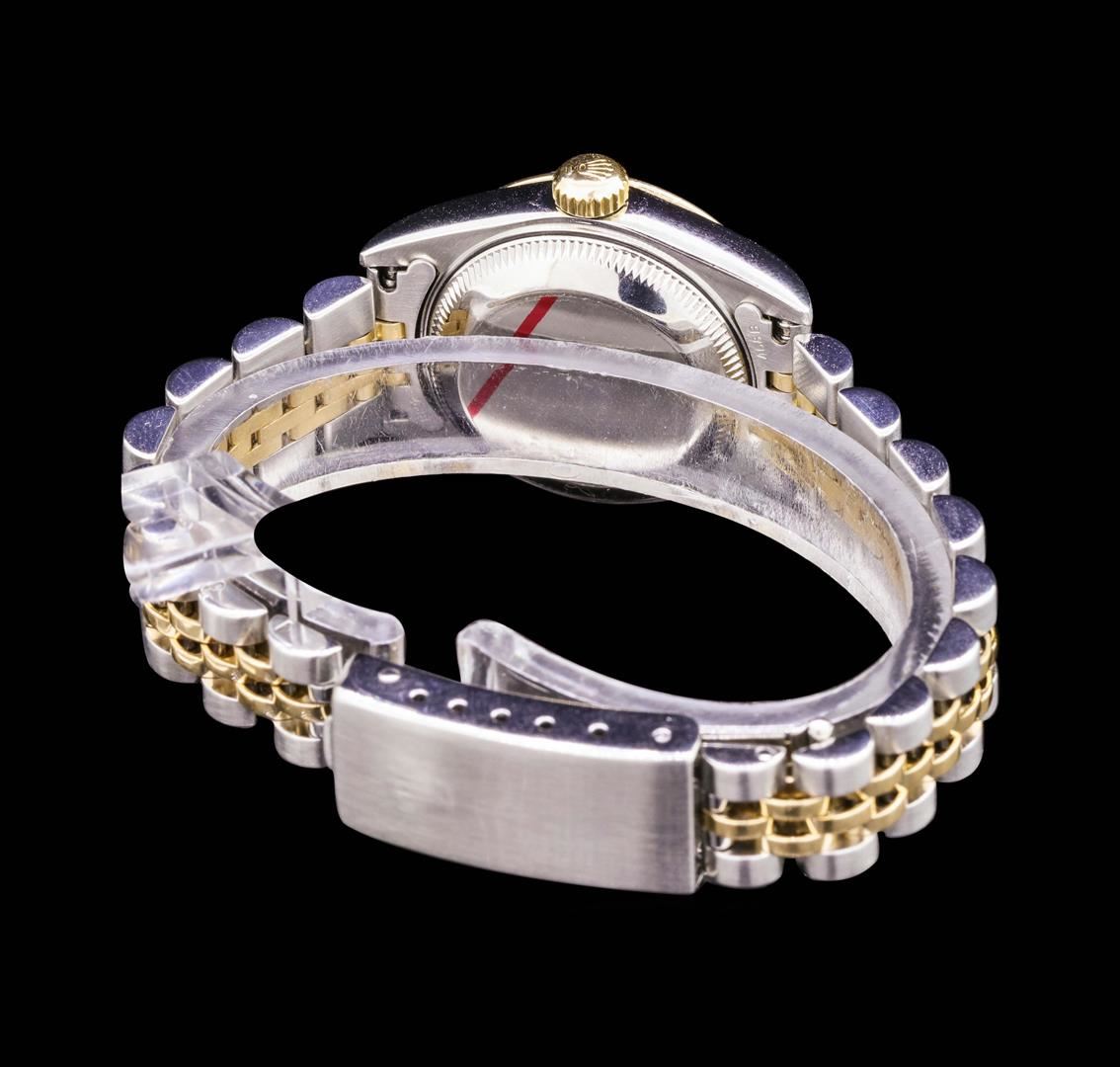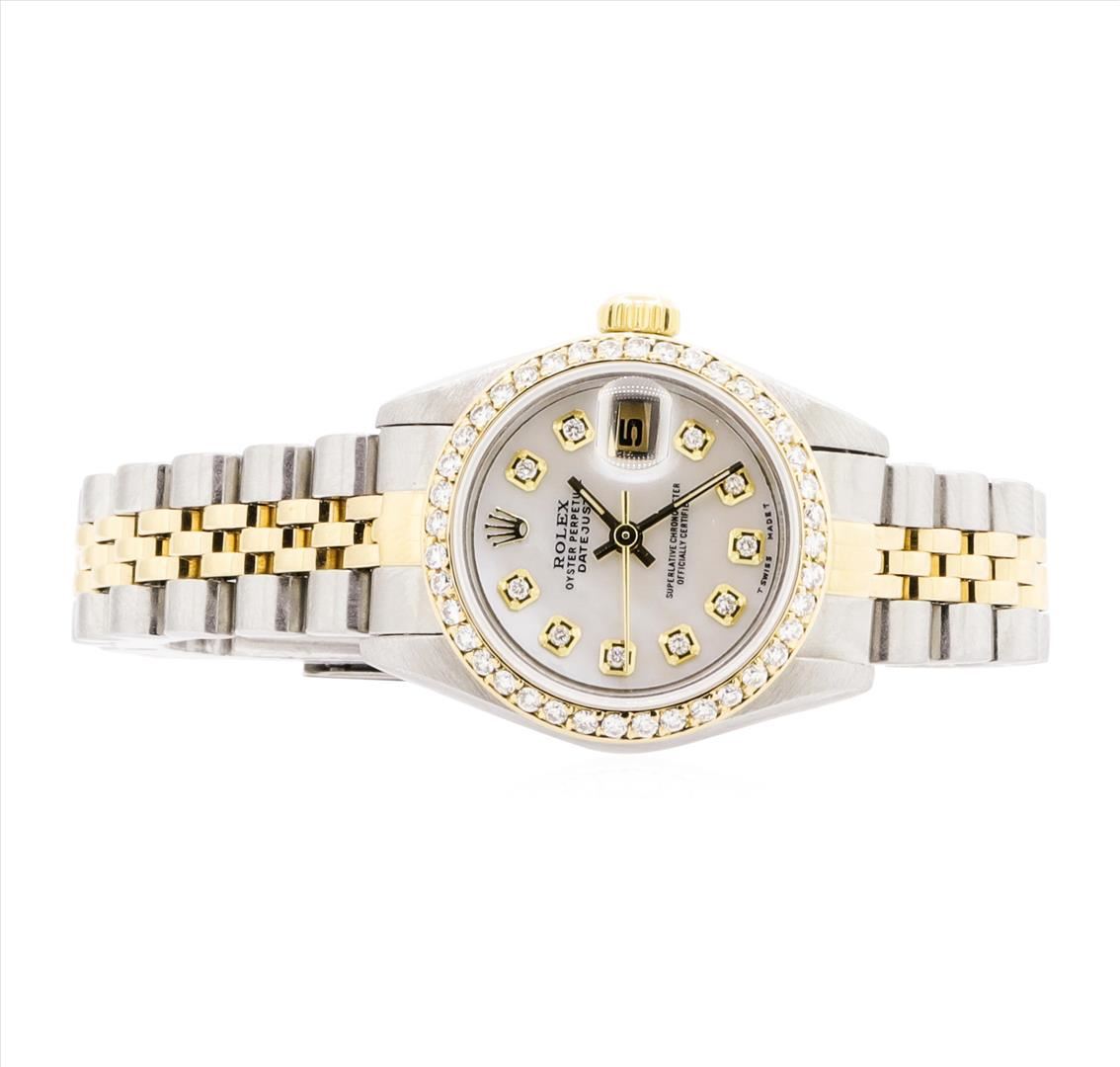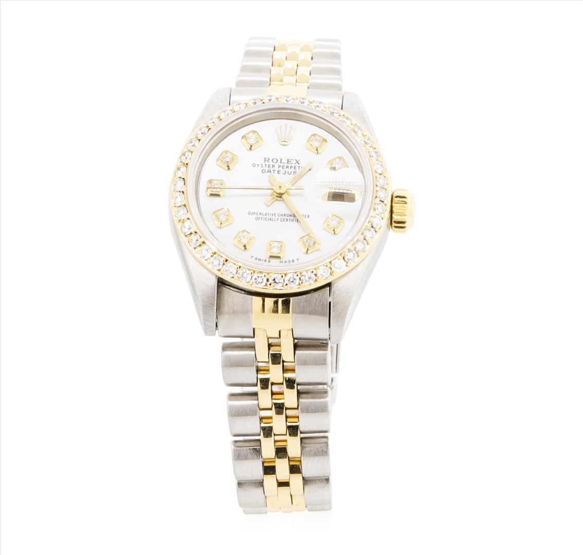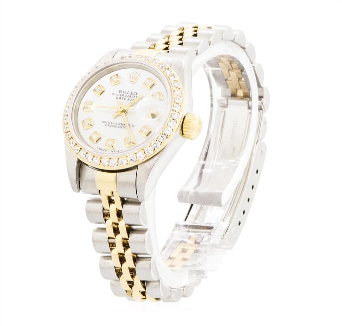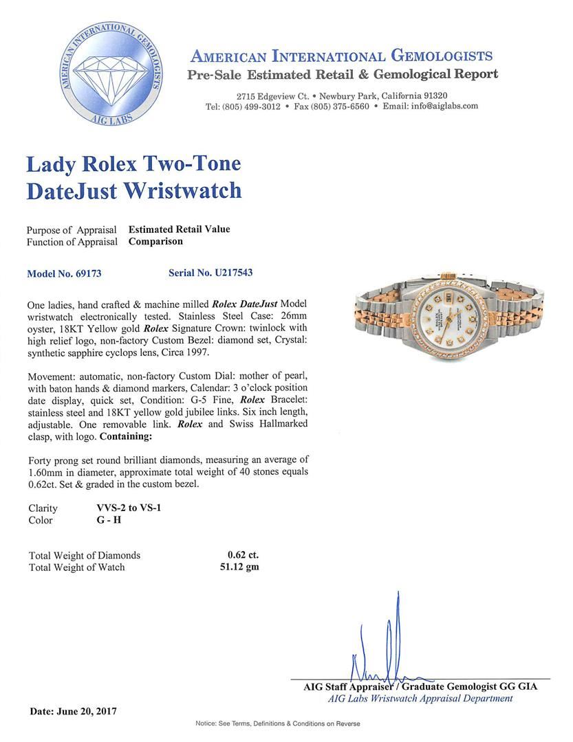 One ladies, hand crafted & machine milled Rolex DateJust Model wristwatch electronically tested. Stainless Steel Case: 26mm oyster, 18KT Yellow gold Rolex Signature Crown: twinlock with high relief logo, non-factory Custom Bezel: diamond set, Crystal: synthetic sapphire cyclops lens, Circa 1997. Movement: automatic, non-factory Custom Dial: mother of pearl, with baton hands & diamond markers, Calendar: 3 o'clock position date display, quick set, Condition: G-5 Fine, Rolex Bracelet: stainless steel and 18KT yellow gold jubilee links. Six inch length, adjustable. One removable link. Rolex and Swiss Hallmarked clasp, with logo. Containing:Forty prong set round brilliant diamonds, measuring an average of 1.60mm in diameter, approximate total weight of 40 stones equals 0.62ct. Set & graded in the custom bezel. Clarity: VVS-2 to VS-1. Color: G - H. Total Weight of Diamonds 0.62ct. Total Weight of Watch 51.12gm. AIG Appraised.