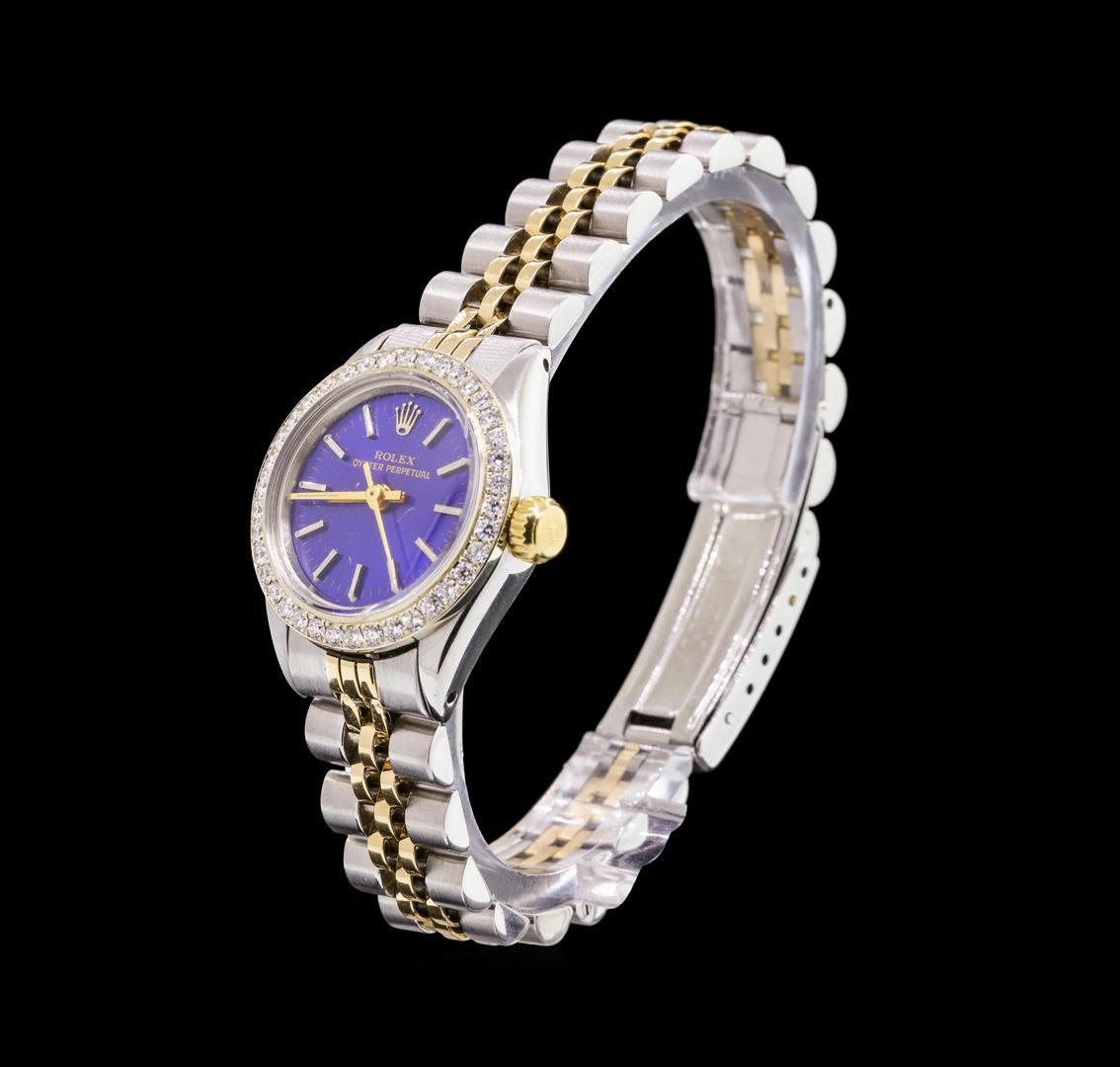 One ladies, hand crafted & machine milled Rolex Oyster Perpetual Model wristwatch electronically tested. Stainless Steel Case: 25mm oyster, Rolex Signature 14KT yellow gold Crown: twinlock with logo, non-factory Custom Bezel: set with diamonds, Crystal: acrylic lens. Circa: 1978.Movement: mechanical stem wind, Rolex signed Dial: Blue color, with baton hands, and raised indices, Condition: G-5 Fine. Rolex Bracelet: stainless steel and 14KT yellow gold jubilee links. Six and one half inch length, adjustable. Two removable links. Rolex Hallmarked clasp, with logo. The logo and markings in the bracelet clasp are Rolex factory stampings. In the past, Rolex has produced parts including clasps in locations other than Switzerland. That is why there is a variation to the look; feel, and weight of Rolex parts that were made in different areas of the world. Today, however all parts are produced in Switzerland. The stamping in the clasp of the watch in this appraisal was created for the Rolex market in the U.S.A. during the 1970's Containing:Thirty Eight prong set round brilliant cut diamonds, measuring an average of 1.80mm in diameter, approximate total weight of 38 Stones = 0.88ct. Set & graded in the custom bezel. Clarity: VS-1 Average. Color: G - H. Total Weight of Diamonds 0.88ct. Total Weight of Watch 47.99gm. AIG Appraised.