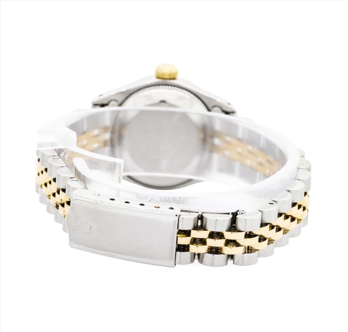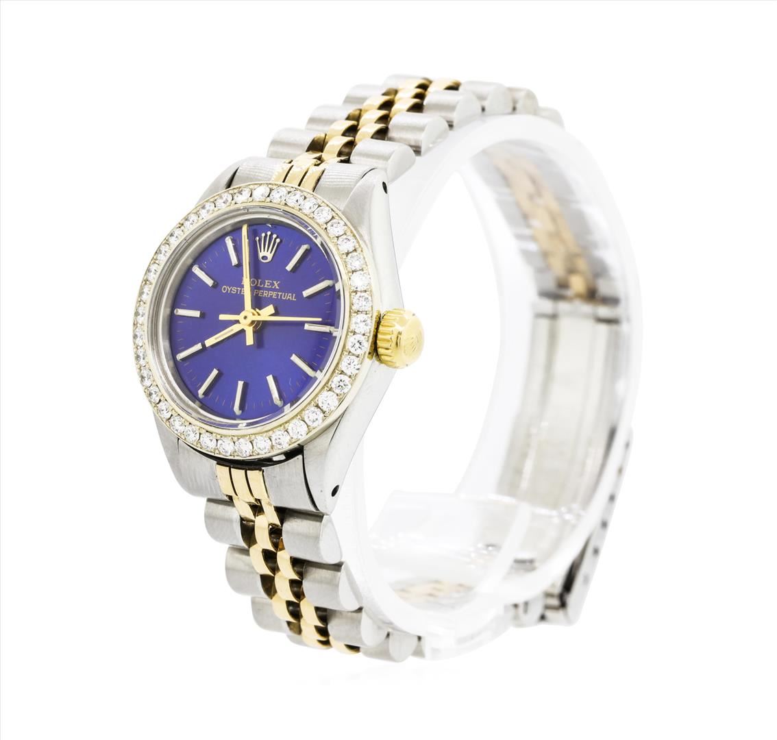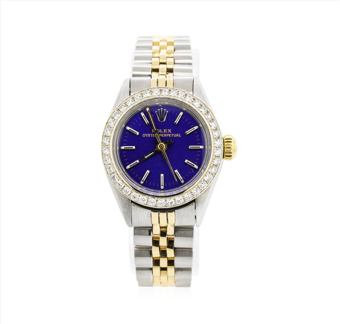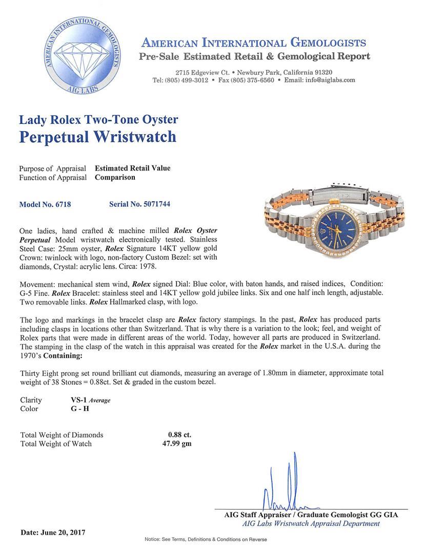 One ladies, hand crafted & machine milled Rolex Oyster Perpetual Model wristwatch electronically tested. Stainless Steel Case: 25mm oyster, Rolex Signature 14KT yellow gold Crown: twinlock with logo, non-factory Custom Bezel: set with diamonds, Crystal: acrylic lens. Circa: 1978.Movement: mechanical stem wind, Rolex signed Dial: Blue color, with baton hands, and raised indices, Condition: G-5 Fine. Rolex Bracelet: stainless steel and 14KT yellow gold jubilee links. Six and one half inch length, adjustable. Two removable links. Rolex Hallmarked clasp, with logo. The logo and markings in the bracelet clasp are Rolex factory stampings. In the past, Rolex has produced parts including clasps in locations other than Switzerland. That is why there is a variation to the look; feel, and weight of Rolex parts that were made in different areas of the world. Today, however all parts are produced in Switzerland. The stamping in the clasp of the watch in this appraisal was created for the Rolex market in the U.S.A. during the 1970's Containing:Thirty Eight prong set round brilliant cut diamonds, measuring an average of 1.80mm in diameter, approximate total weight of 38 Stones = 0.88ct. Set & graded in the custom bezel. Clarity: VS-1 Average. Color: G - H. Total Weight of Diamonds 0.88ct. Total Weight of Watch 47.99gm. AIG Appraised.