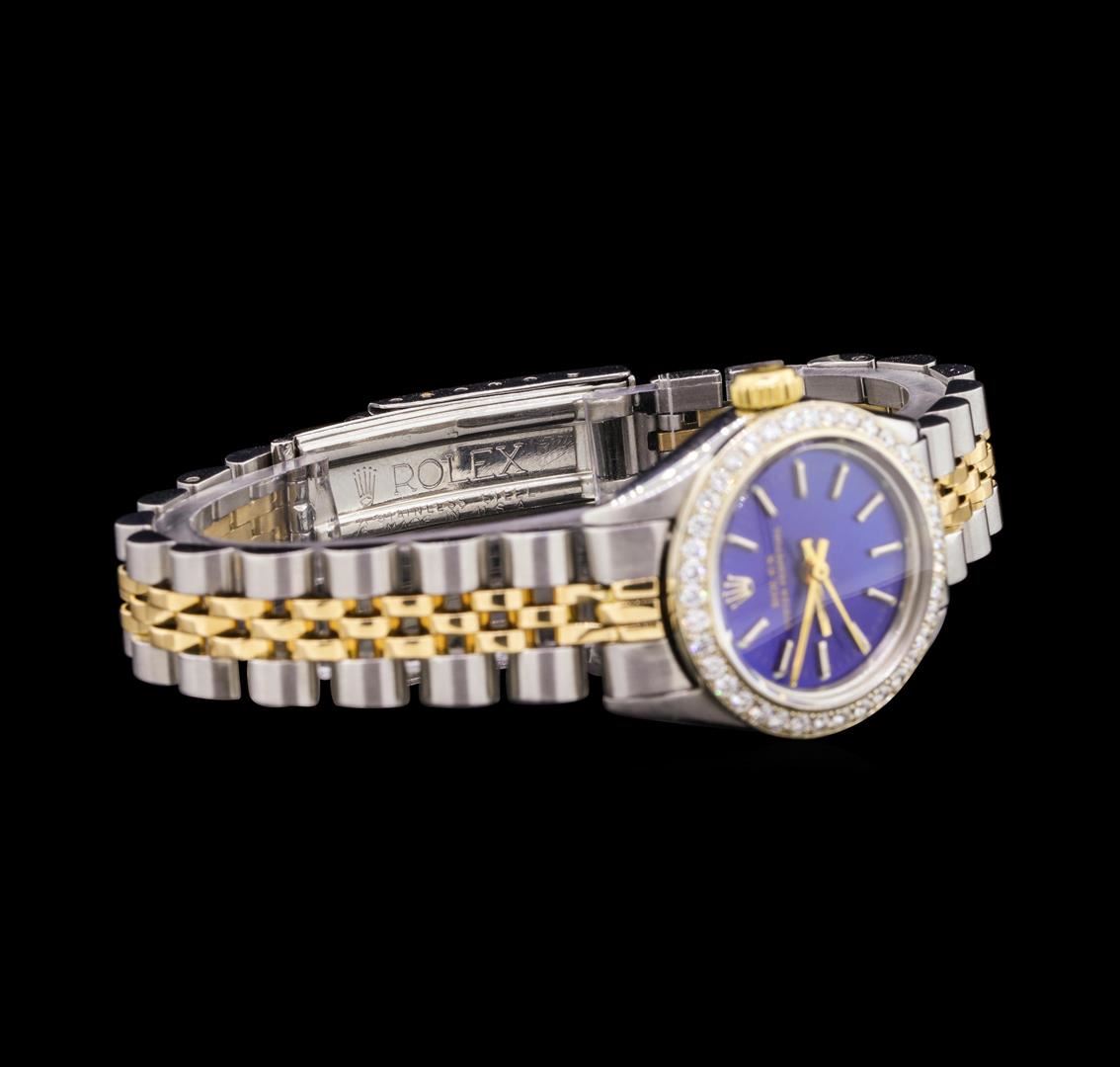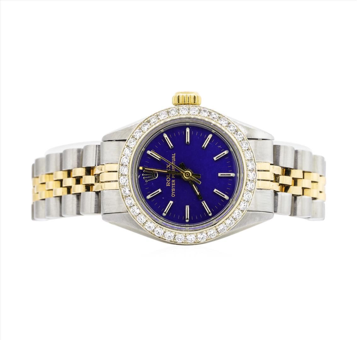 One ladies, hand crafted & machine milled Rolex Oyster Perpetual Model wristwatch electronically tested. Stainless Steel Case: 25mm oyster, Rolex Signature 14KT yellow gold Crown: twinlock with logo, non-factory Custom Bezel: set with diamonds, Crystal: acrylic lens. Circa: 1978.Movement: mechanical stem wind, Rolex signed Dial: Blue color, with baton hands, and raised indices, Condition: G-5 Fine. Rolex Bracelet: stainless steel and 14KT yellow gold jubilee links. Six and one half inch length, adjustable. Two removable links. Rolex Hallmarked clasp, with logo. The logo and markings in the bracelet clasp are Rolex factory stampings. In the past, Rolex has produced parts including clasps in locations other than Switzerland. That is why there is a variation to the look; feel, and weight of Rolex parts that were made in different areas of the world. Today, however all parts are produced in Switzerland. The stamping in the clasp of the watch in this appraisal was created for the Rolex market in the U.S.A. during the 1970's Containing:Thirty Eight prong set round brilliant cut diamonds, measuring an average of 1.80mm in diameter, approximate total weight of 38 Stones = 0.88ct. Set & graded in the custom bezel. Clarity: VS-1 Average. Color: G - H. Total Weight of Diamonds 0.88ct. Total Weight of Watch 47.99gm. AIG Appraised.