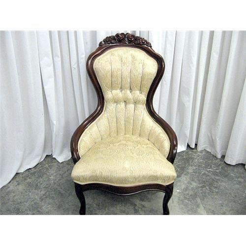We have for sale a victorian ladies chair. The chair has alot of detail carving of roses on top. The wood has a walnut stain. There is no manufacturers tag, I believe it was made in the 1960's, although I do not know the exact age or date. The wood is in real good condition. There is no chips or split in the wood. The fabric is in real good condition. It is a light cream color. There is a couple of small stains on the seat toward the back. We have plenty of pictures. It weighs 32 Pounds and measures 40.5 x 27 x 32.5.
