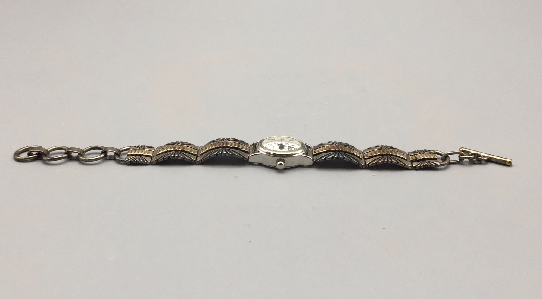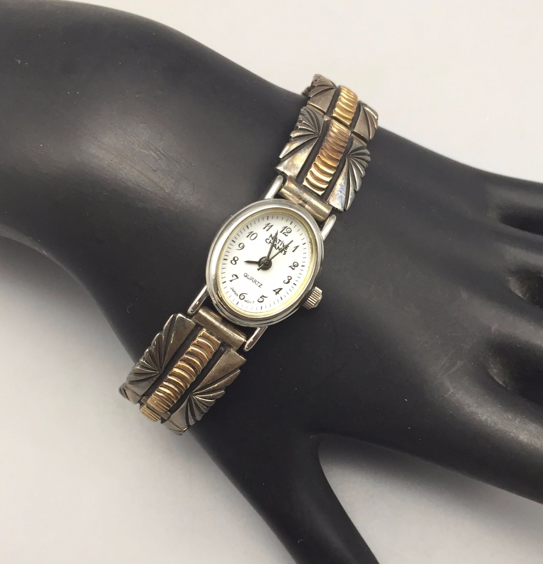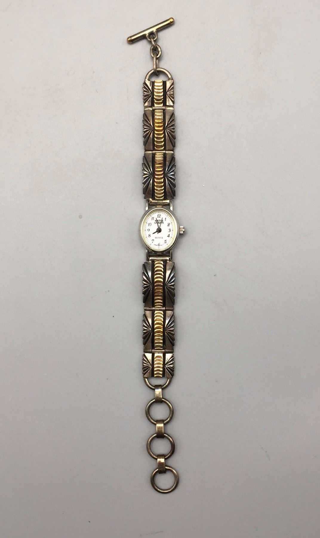 Maker: Herbert Begaye, Navajo. Approx. Age: Vintage. Size: Fits 7” around the wrist and is 5/8” at its widest point. Weighs 30.2 g. Additional Info: Sterling silver and 14k gold watch band and watch. Condition: Good. Normal wear expected. Please look closely at the pictures - they are an important part of our description. Shipping: There will be a $5 handling / packaging fee for shipping this lot. The actual cost of postage will be added on top of that.