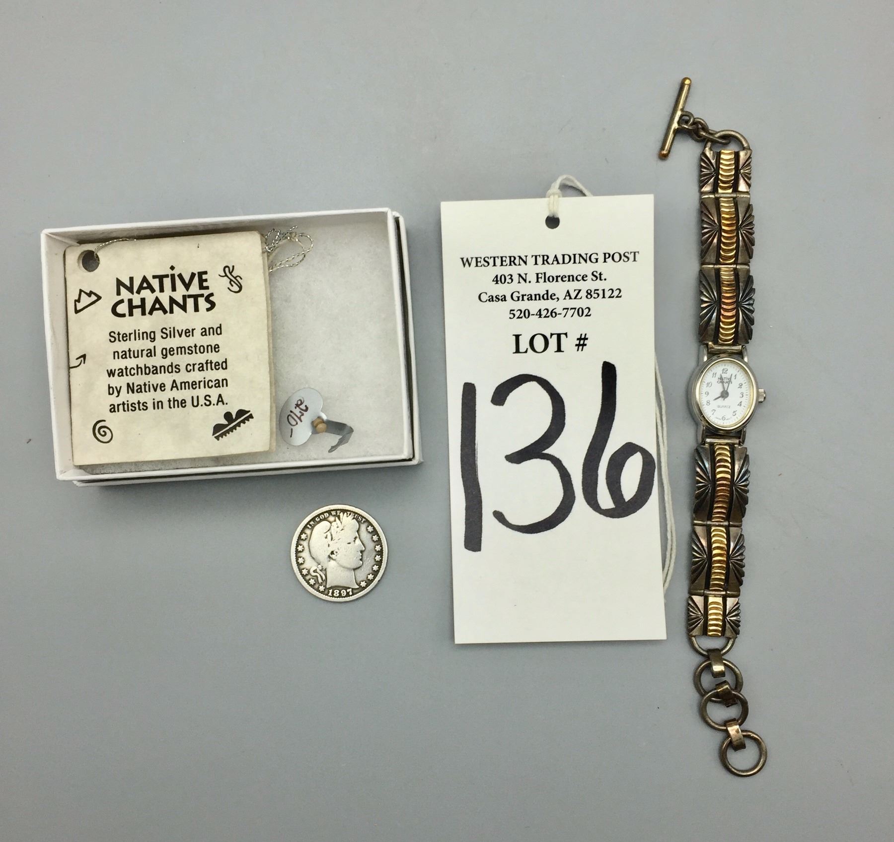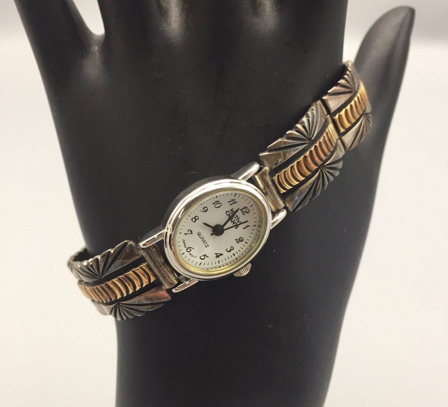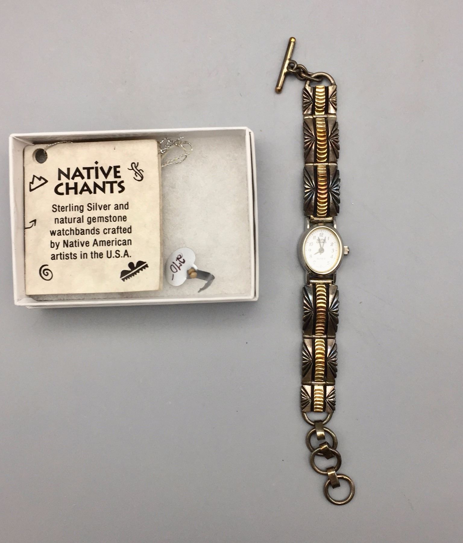 Maker: Herbert Begaye, Navajo. Approx. Age: Vintage. Size: Fits 7” around the wrist and is 5/8” at its widest point. Weighs 30.2 g. Additional Info: Sterling silver and 14k gold watch band and watch. Condition: Good. Normal wear expected. Please look closely at the pictures - they are an important part of our description. Shipping: There will be a $5 handling / packaging fee for shipping this lot. The actual cost of postage will be added on top of that.
