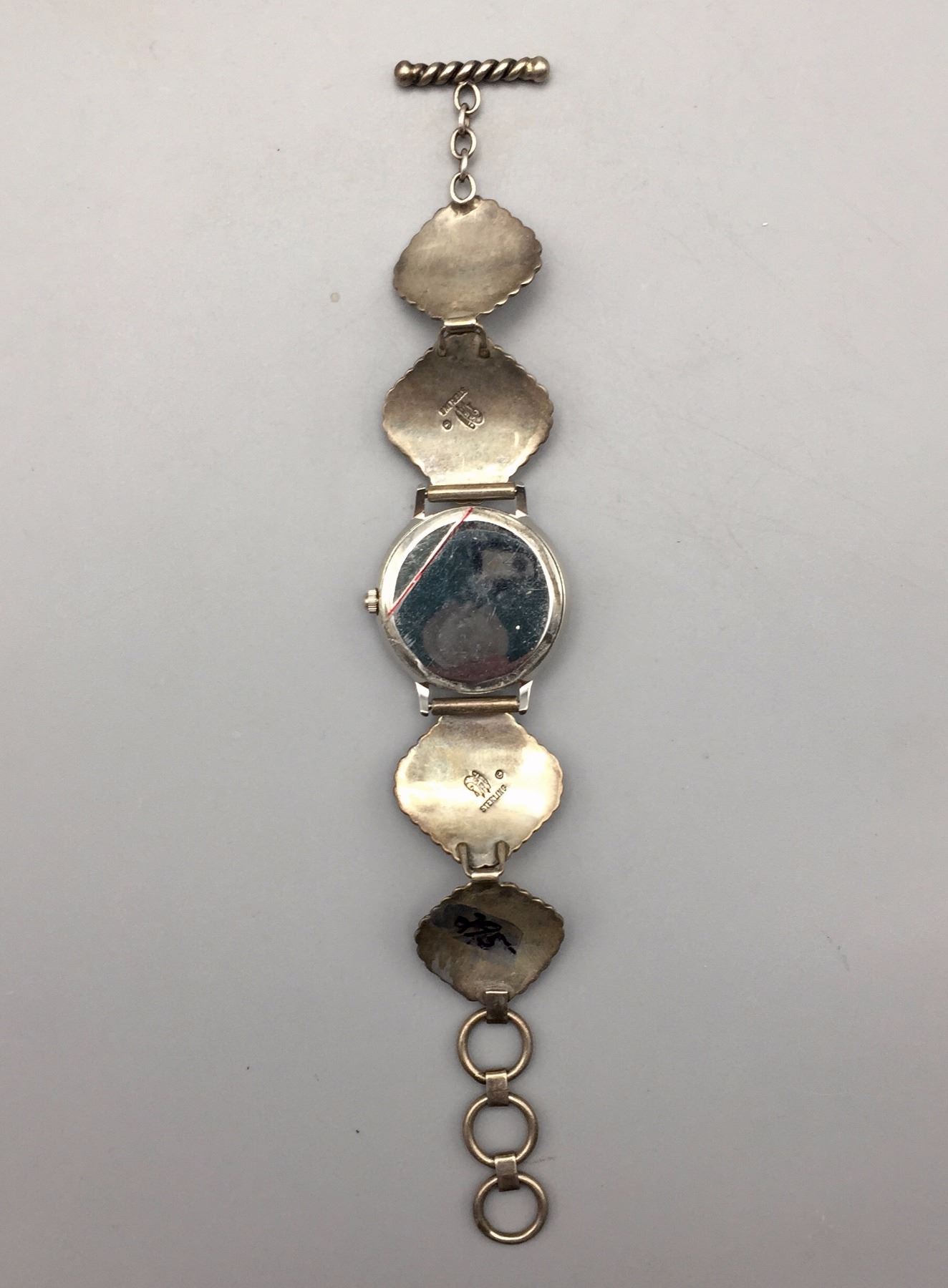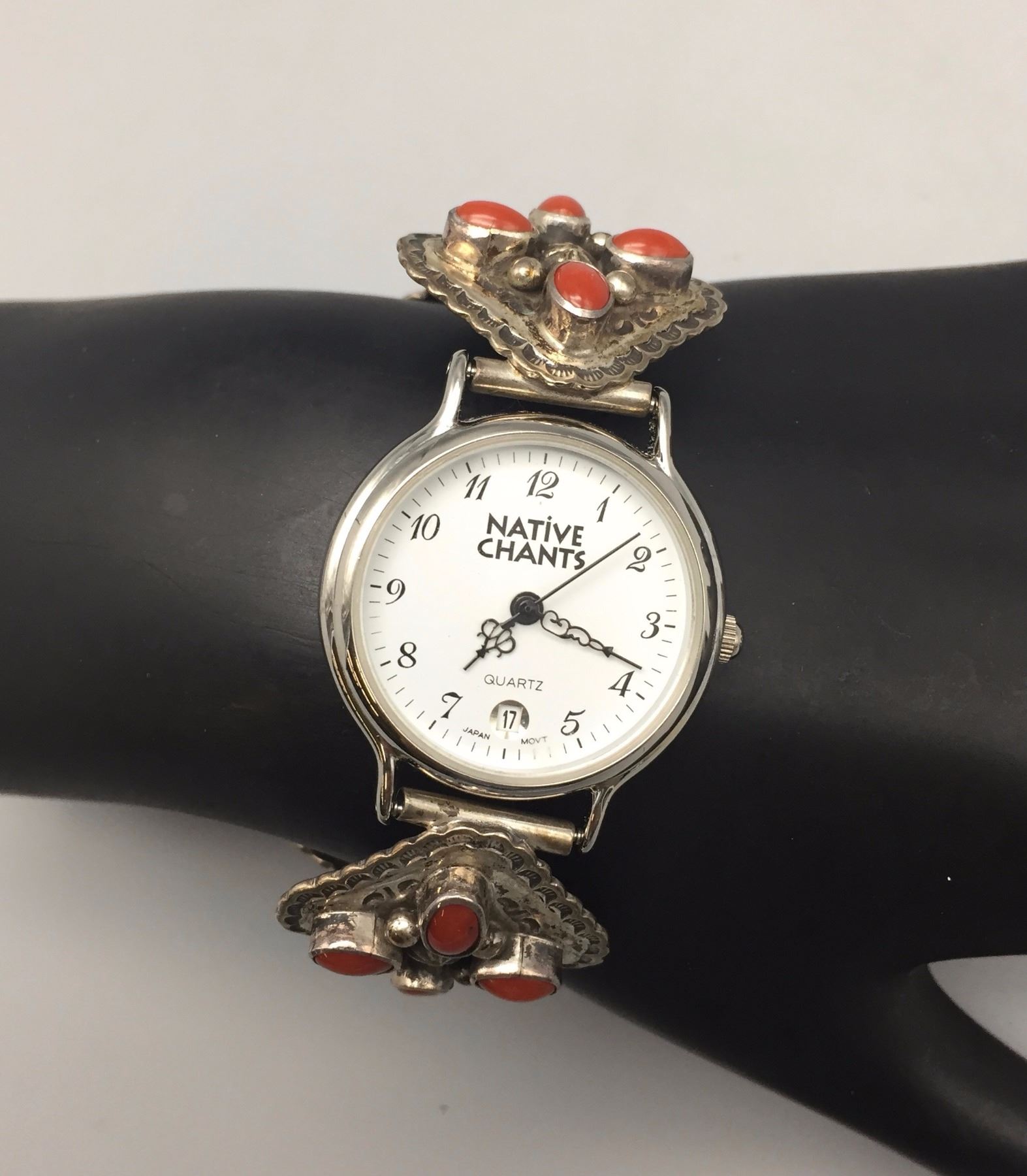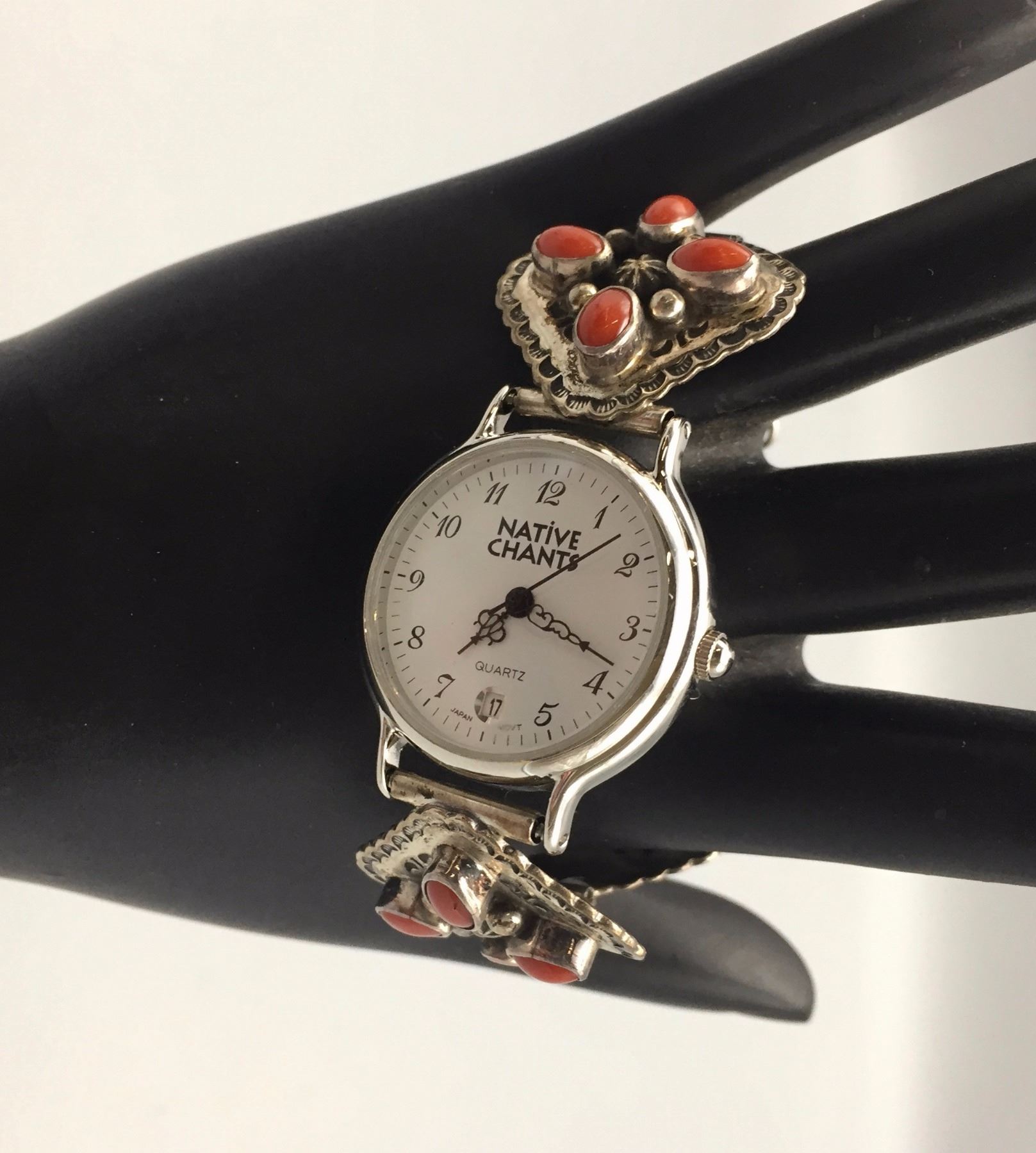 Maker: Unknown maker. Approx. Age: Vintage. Size: Fits 6 3/4” around the wrist and is 1 1/8” at its widest point. Weighs 37.4 g. Additional Info: Sterling silver watch band with nice coral stones. Condition: Good. Normal wear expected. Please look closely at the pictures - they are an important part of our description. Shipping: There will be a $5 handling / packaging fee for shipping this lot. The actual cost of postage will be added on top of that.