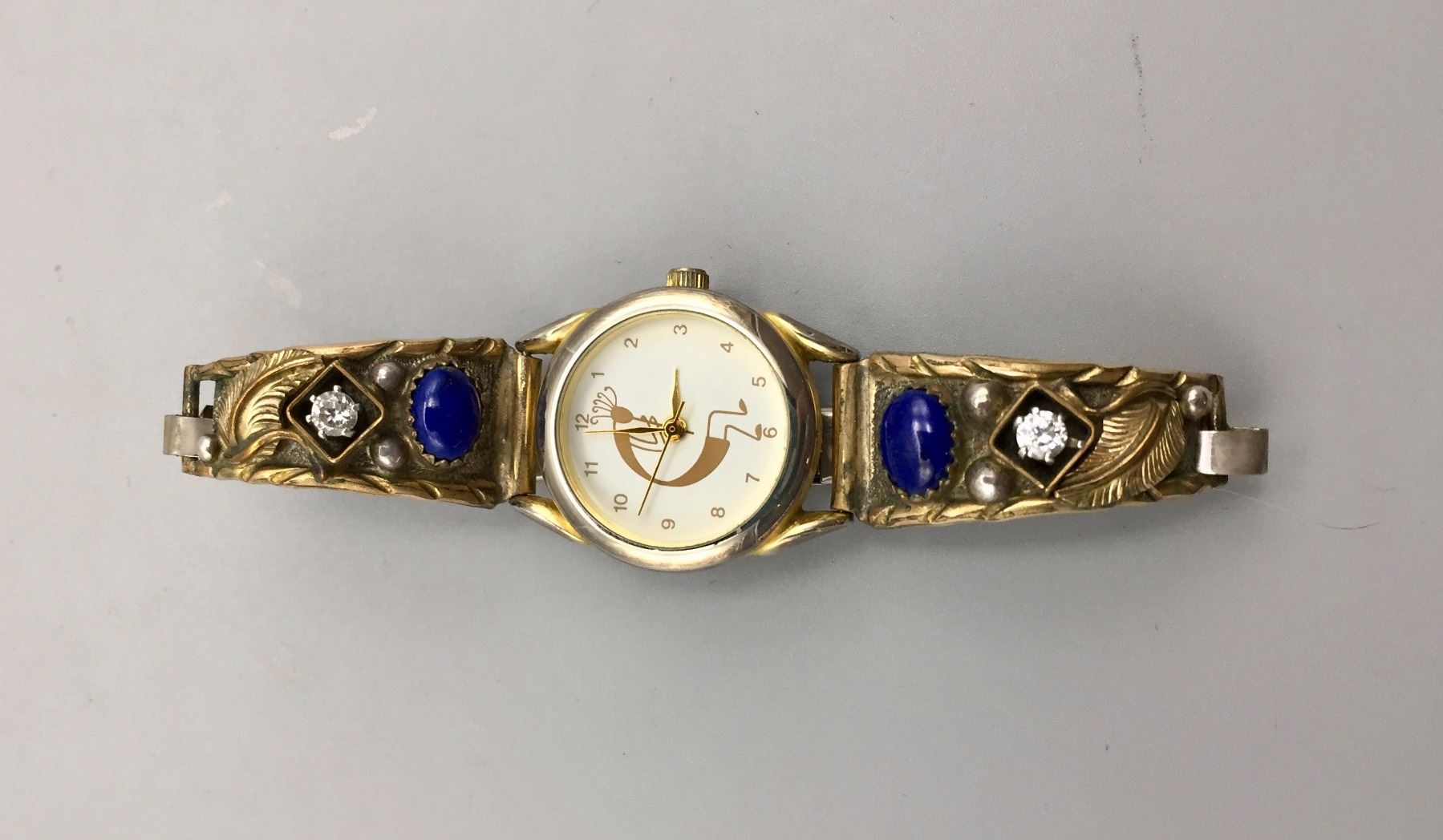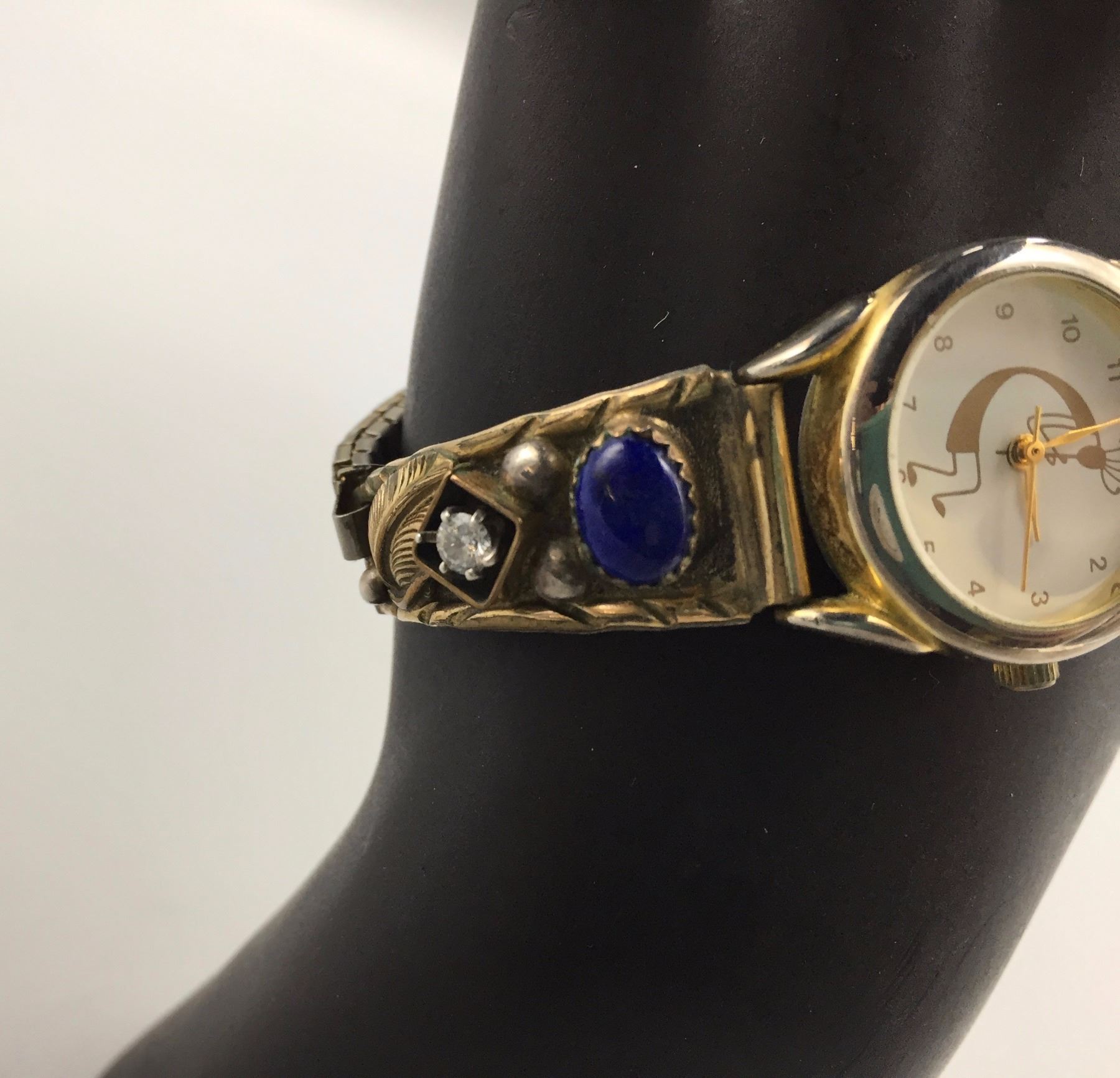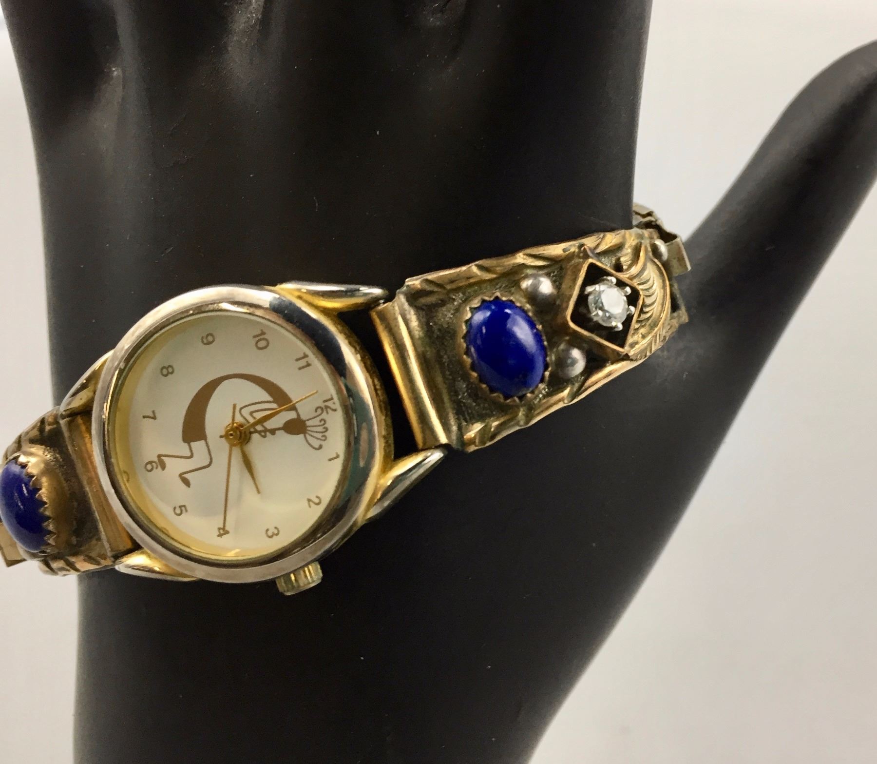 Maker: Hallmarked DD, could be one of many Navajo makers. Approx. Age: Fairly modern, 1980s or so. Size: Fits a 6 1/2” wrist. Watch tips are 1/2” at their widest point. Weighs 26.6 g. Additional Info: Kokopelli design on watch face, tips are sterling silver and 12K GF with a lapis stone and CZ in each. Condition: Good for it’s age, normal wear expected. Watch appears to be working and keeping time. Please look closely at the pictures - they are an important part of our description. Shipping: There will be a $5 handling / packaging fee for shipping this lot. The actual cost of postage will be added on top of that.