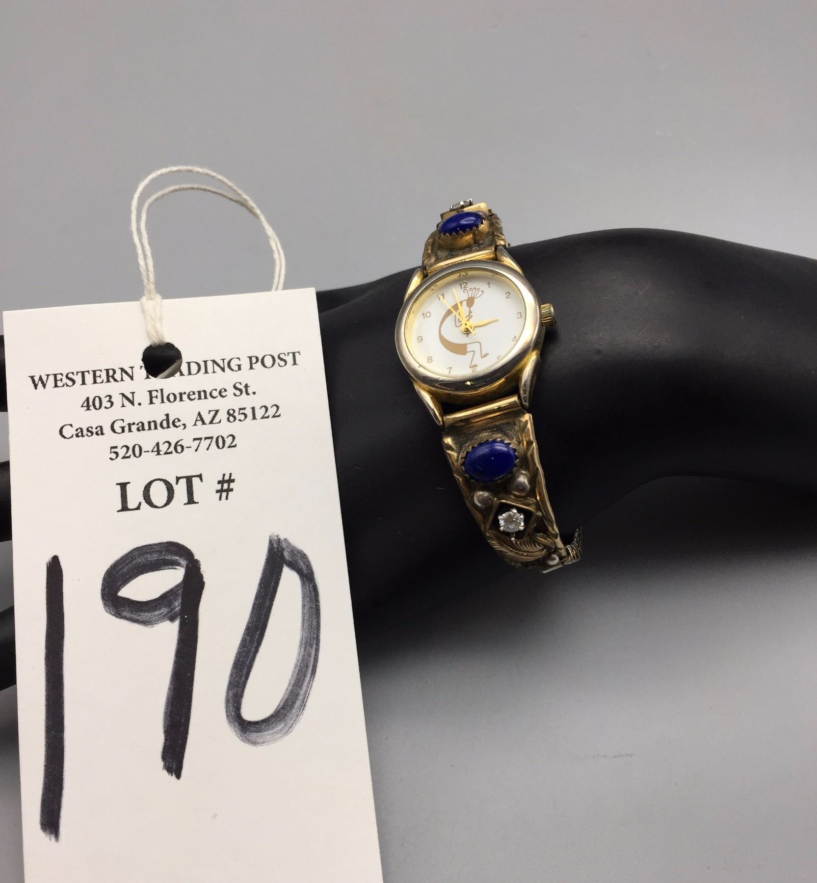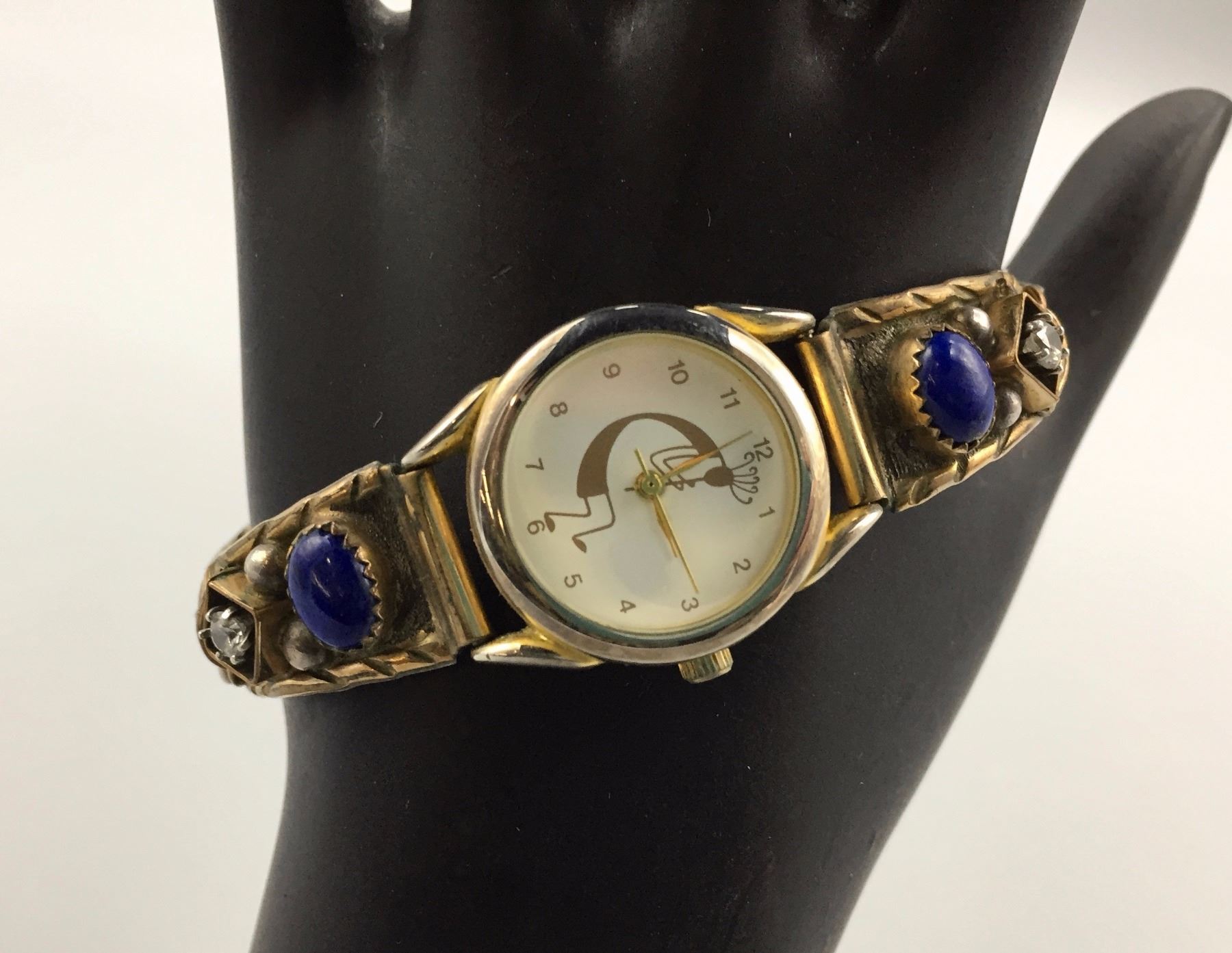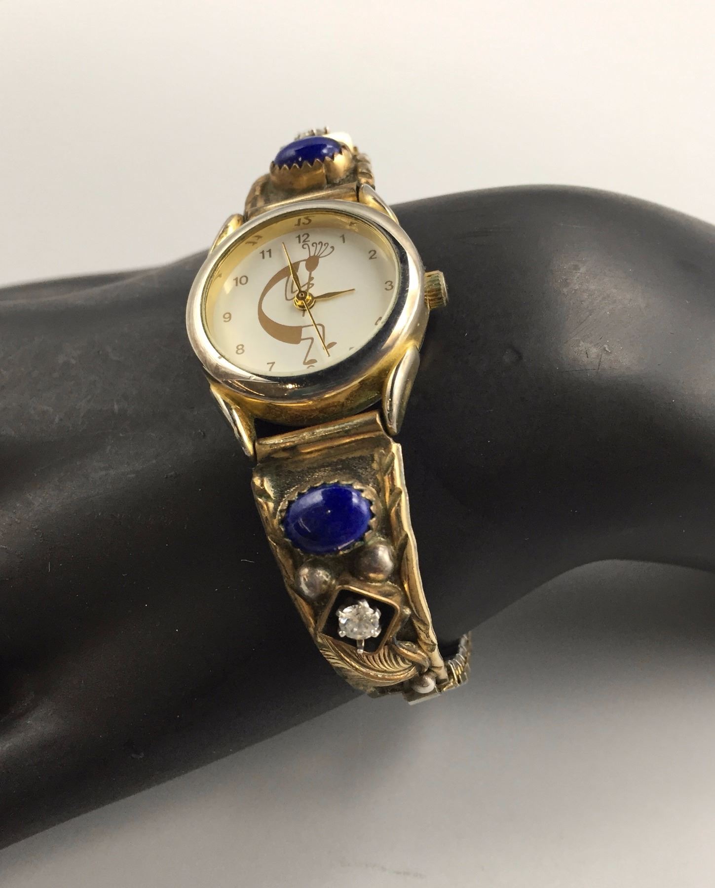 Maker: Hallmarked DD, could be one of many Navajo makers. Approx. Age: Fairly modern, 1980s or so. Size: Fits a 6 1/2” wrist. Watch tips are 1/2” at their widest point. Weighs 26.6 g. Additional Info: Kokopelli design on watch face, tips are sterling silver and 12K GF with a lapis stone and CZ in each. Condition: Good for it’s age, normal wear expected. Watch appears to be working and keeping time. Please look closely at the pictures - they are an important part of our description. Shipping: There will be a $5 handling / packaging fee for shipping this lot. The actual cost of postage will be added on top of that.