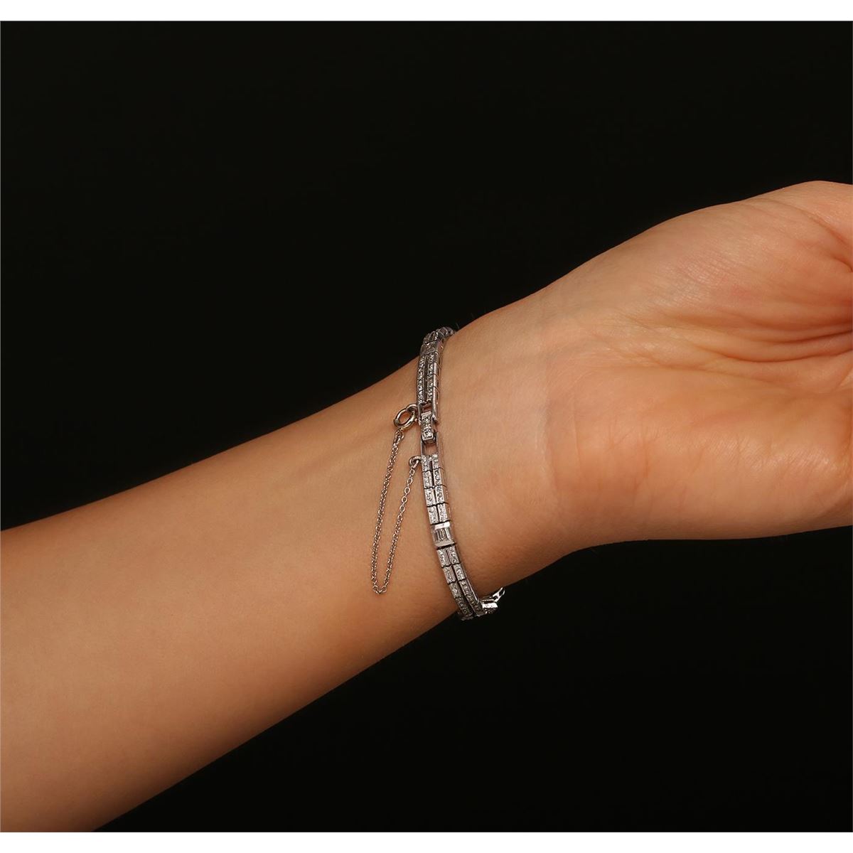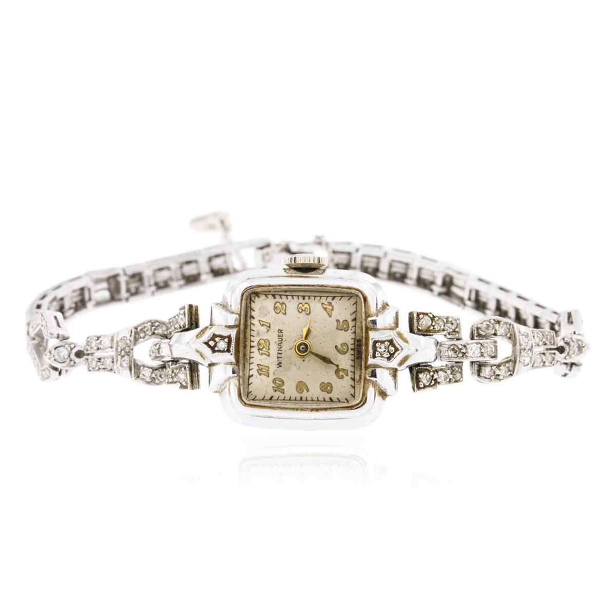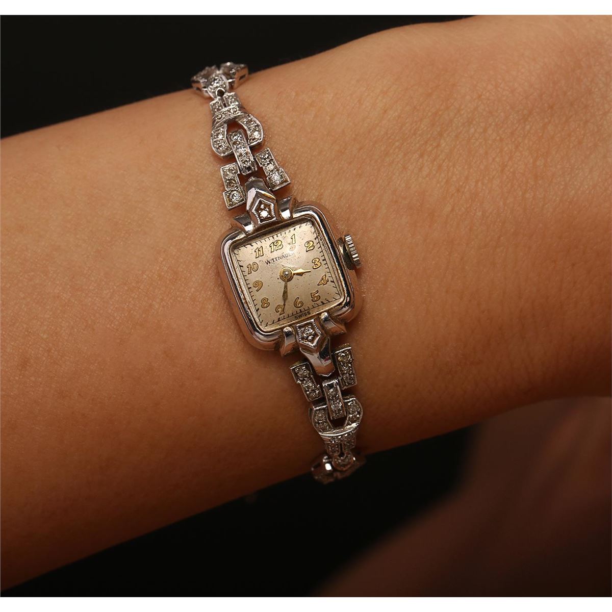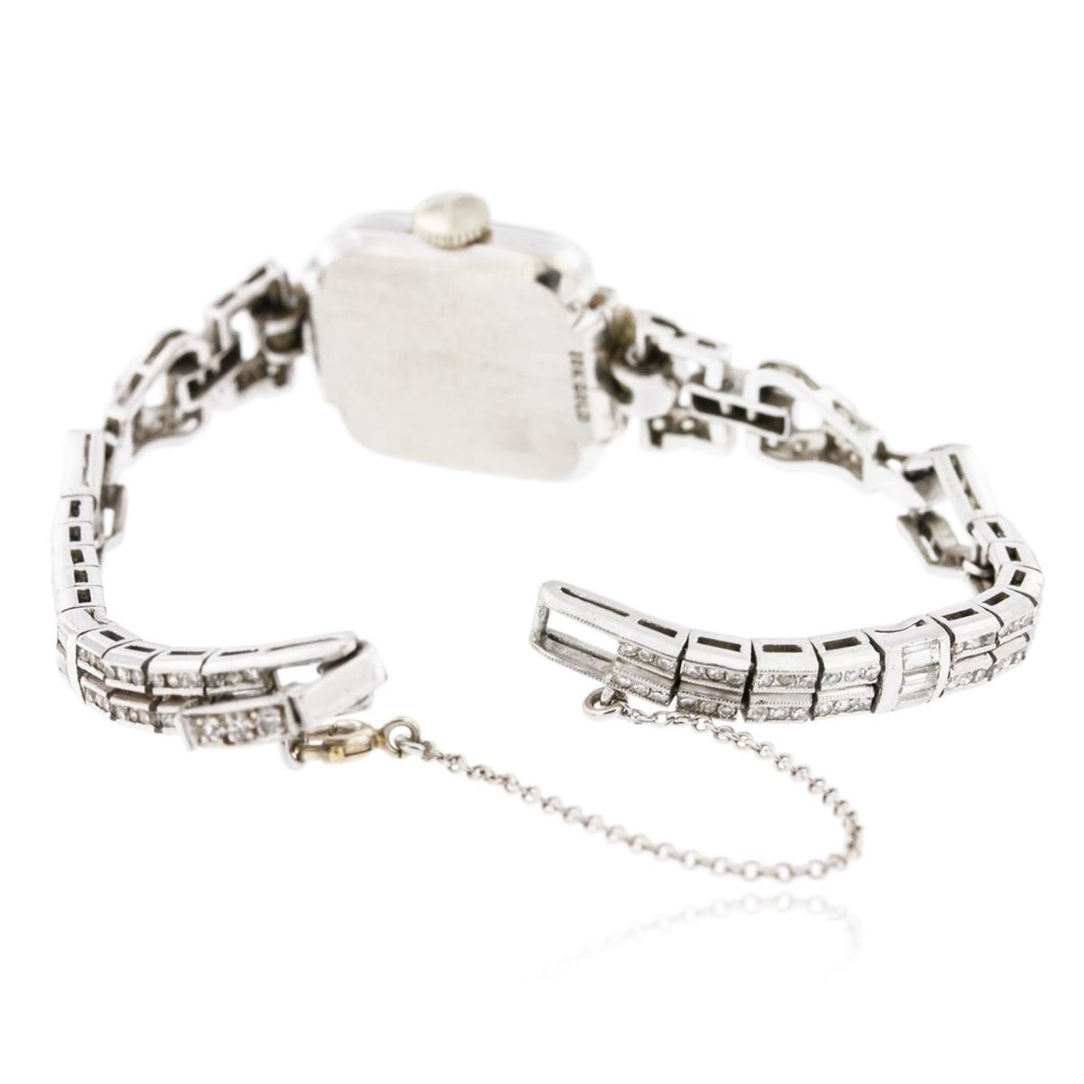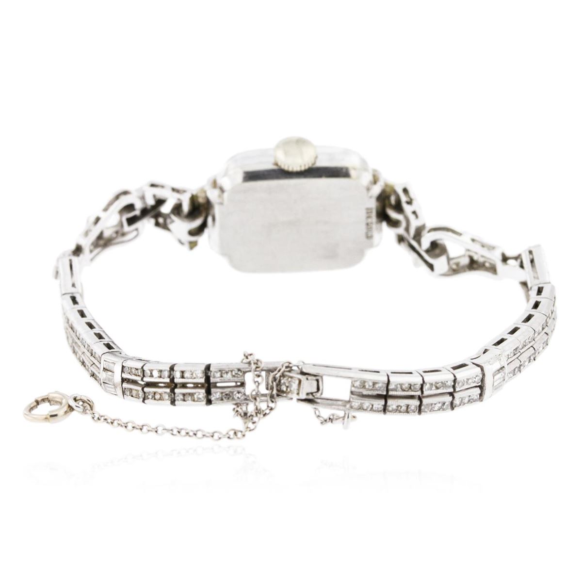 One ladies Wittnauer wristwatch electronically tested, case: 10KT white gold, 19 x 17mm, bezel: polished , crystal: acrylic lens, movement: Wittnauer swiss seventeen jewel unadjusted mechanical. Dial: baton pointed hands and numerals and numerals, platinum bracelet: set with diamonds, condition is G-4 average. Six inch length. Containing: One hundred seventy prong and chanel set single cut diamonds, measuring 1.70 x 1.10 x 0.77mm (depth est.) approximate total weight of 170 stones = 1.03ct. Graded in the setting. Clarity VS-1 to SI-2. Color G - I. Six chanel set baguette cut diamonds, measuring from 2.50 x 1.30 x 0.91mm (depth est.) approximate total weight of 6 stones = 0.17ct. Graded in the setting. Clarity VS-1 to SI-2. Color H - I. Total weight of diamonds 1.20ct. Total weight of watch 21.19gm. AIG Appraised at $3,990.00.