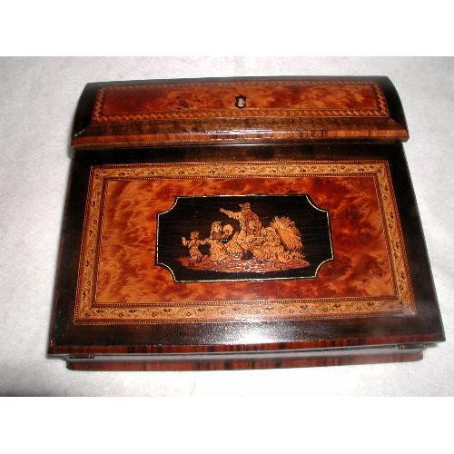 </font></strong>Handsome 19th century ladies writing slope from England consists of ebony sides front and back with rust burl and rosewood face,mahogany interior and gorgeous inlay on the front. Excellent condition,one tiny piece of inlay missing on lower right side. Lined with black felt and edged with black trim obviously redone over the lifetime as usually leather. This too in excellent condition. Removable mahogany tray for pens on upper interior with compartment below as well as two compartments either side that held the ink wells. Banded inlay on bottom of slope. Lock with brass underplate on upper,no key. Measures 12L X 10W X 3 5/8H. Additional photos available.</font>