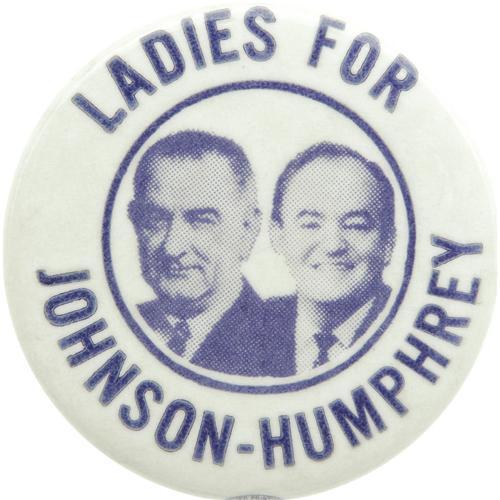 <B>Ladies for Johnson - Humphrey Jugate 1½" Pinback.</B></I> A rare button from the 1964 presidential campaign with a quaint and somewhat offensive message by modern feminist standards. Photos of candidates are shown in a central circle surrounded by blue type. Excellent condition.<BR><BR><b>Shipping:</b> Miscellaneous Collectibles, Smal (<a target="_blank" href="http://www.heritageauctions.com/common/shipping.php">view shipping information</a>)