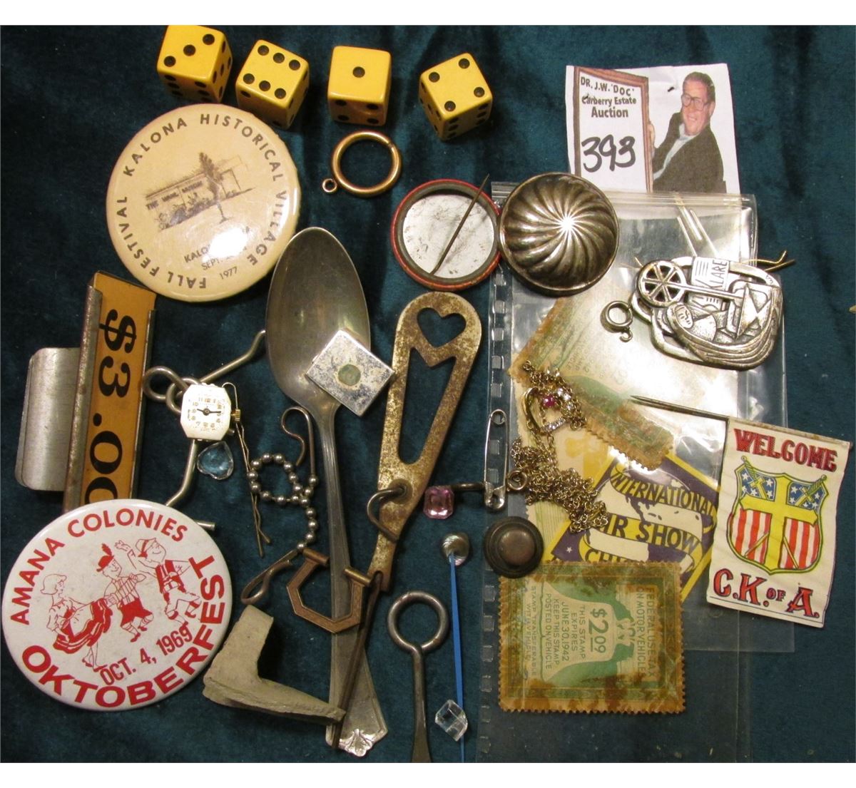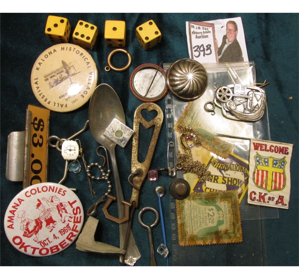 Ladies heart-shaped necklace, possibly a Ruby (but sold as is); Sterling Silver Spoon; an a whole lot of junk and debris.