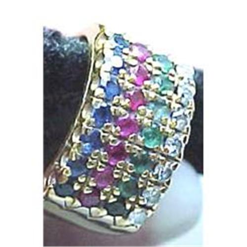14 KYG. Sapphire. Ruby. Diamond. Emerald. Wide gold ring with each row of prong set gems are all one color.