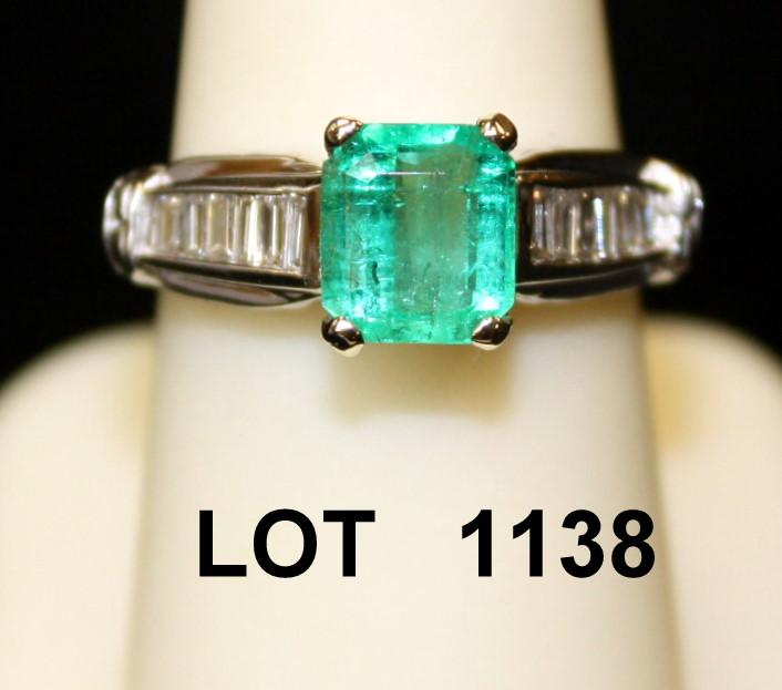 Ladies ring set showing 1.40ct emeralds and 12 baguette diamonds weighing .6ct, set in 14kt white gold. Est: $2,000 - $3,000