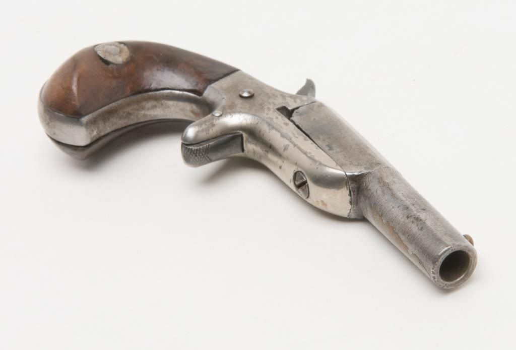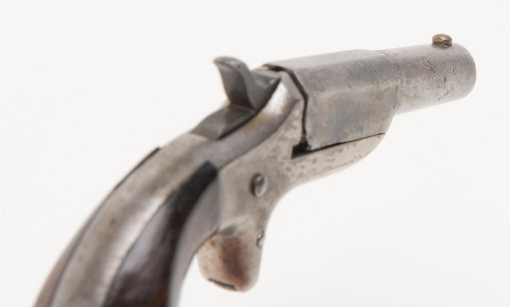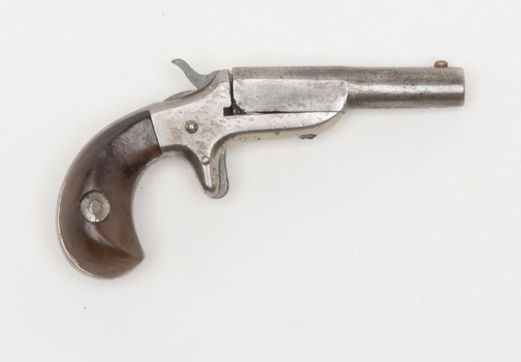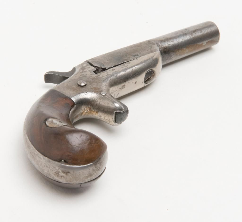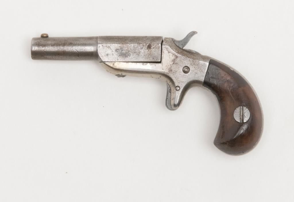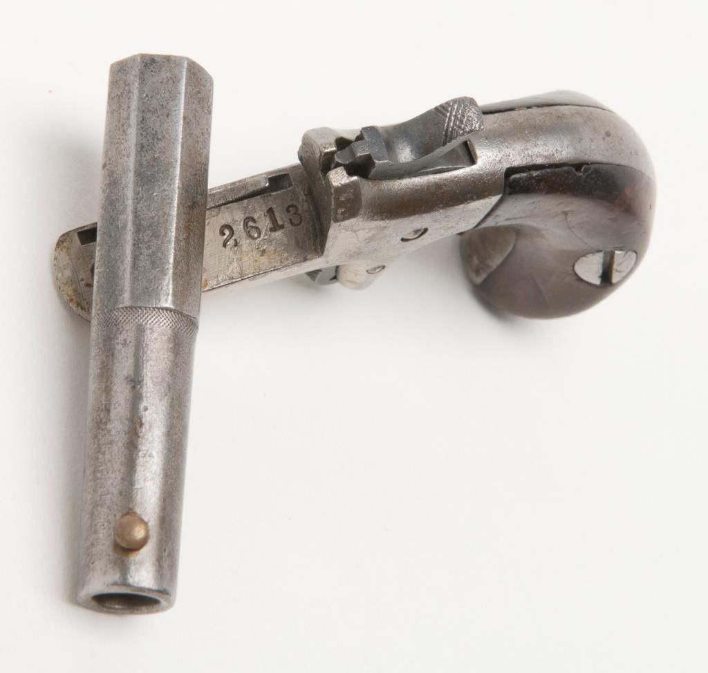 Ladies single shot spur trigger Muff Pistol, approximately .22 caliber, Serial #NSNV. The pistol is in overall good condition with a 2” barrel. This diminutive pistol retains little original finish, with smooth wood grips in goodoverall condition. (Antique). Est.: $125-$250.