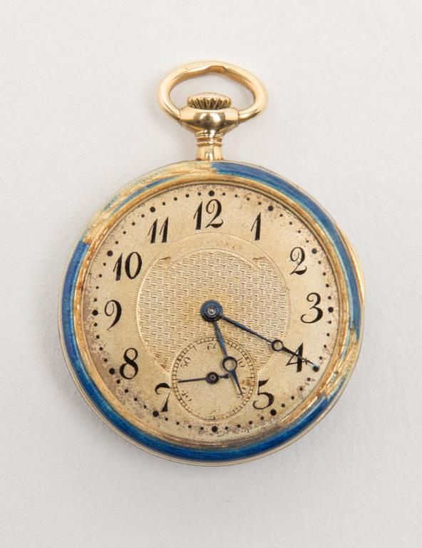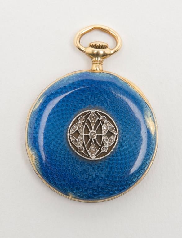 Ladies small lapel size watch marked 18k and Tiffany & Co. on interior with #1880562. Movement signed Longine and #’d to match. The enamel is in a blue faberge color with intricate center decoration in white gold or platinum filigree,with very small single cut diamonds (this decoration of period/but added). The mechanism is running, considerable loss of enamel. No crystal. Est.: $300 - $600