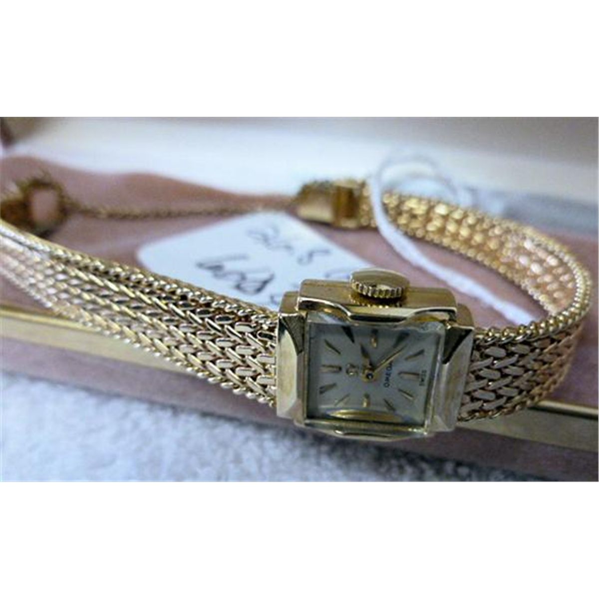 Ladies watch - Omega - Swiss - gold bracelet mesh - square face - 1/2" - TESTED 14kt - 26.8 grams - clasp stamped 14KT