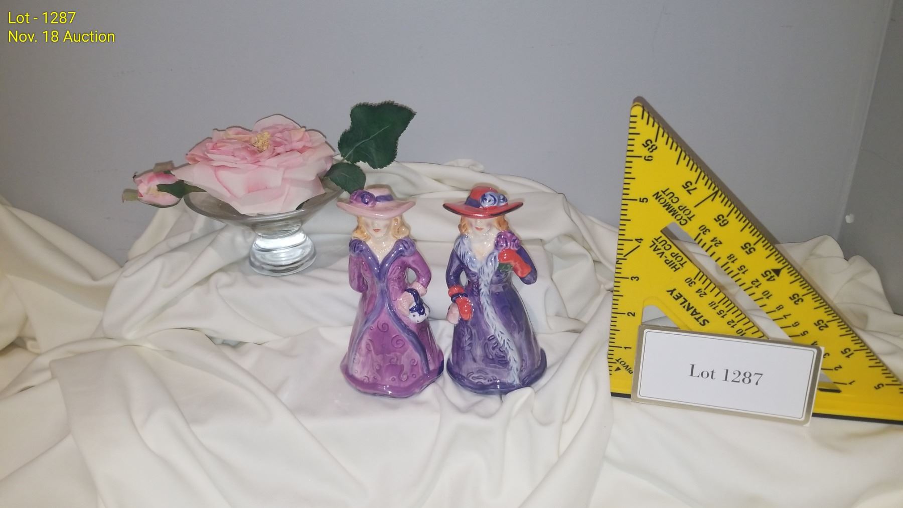 "Ladies with Red and Pink Hats" Salt and Pepper Shakers and Rose Dish with Artificial Rose