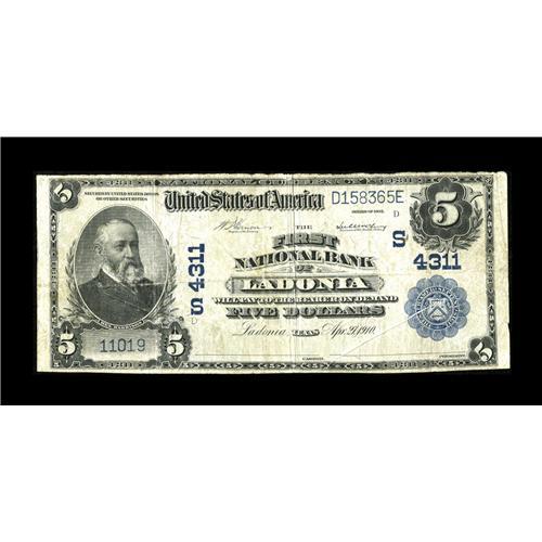 <B>Ladonia, TX</B></I> - $5 1902 Plain Back Fr. 601 <B>The First NB</B></I> Ch. # (S)4311<BR>While three issuers were located here, this is the only bank within the reach of most collectors, as the Ladonia National Bank remains unreported and the Weldon National Bank is represented in the census by just a single note. Both those institutions failed prior to the issuance of the Third Charter designs. The example we offer tonight is fully <B>Fine,</B></I> although the signatures have faded from honest use. We expect to see a realization in the range of...<BR><BR><b>Shipping:</b> Coin/Currency (<a target="_blank" href="http://www.heritageauctions.com/common/shipping.php">view shipping information</a>)