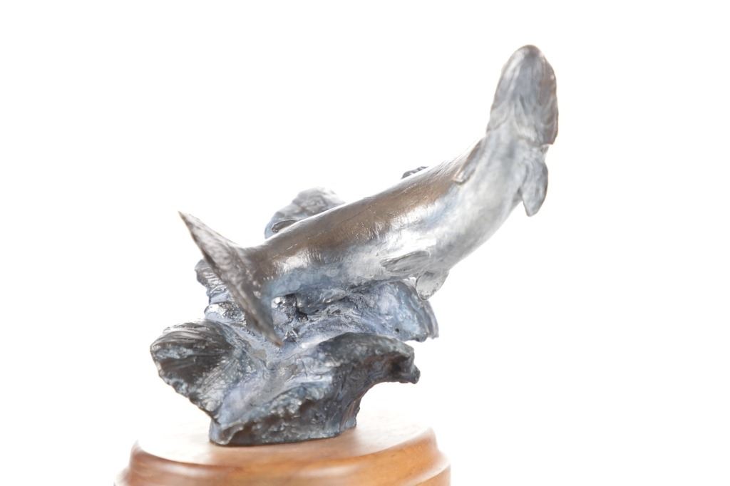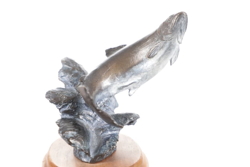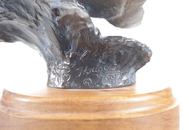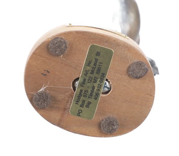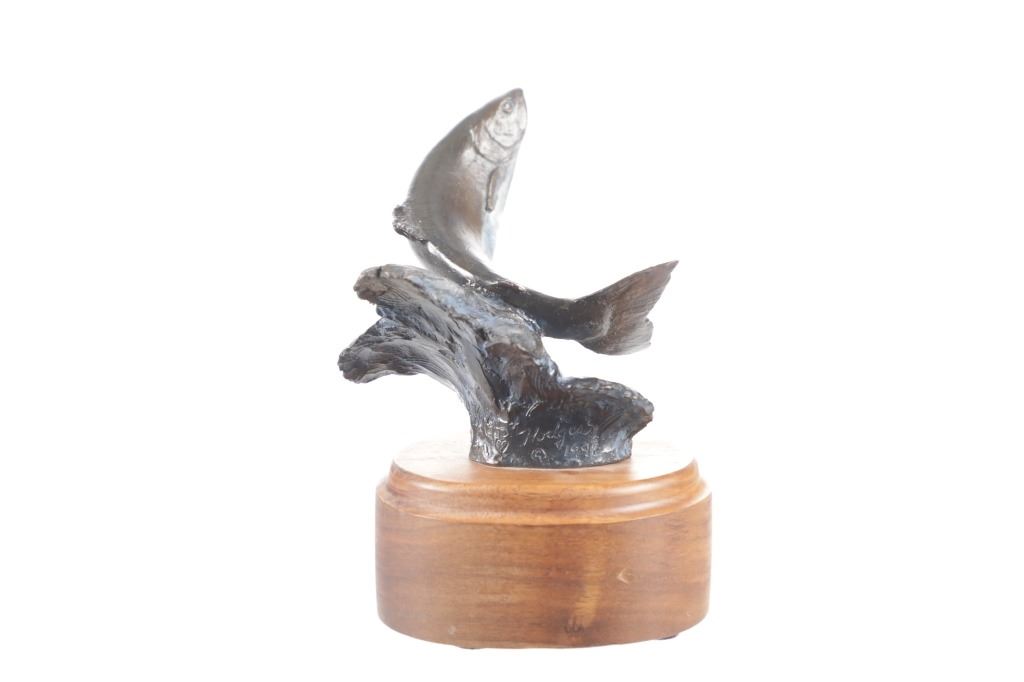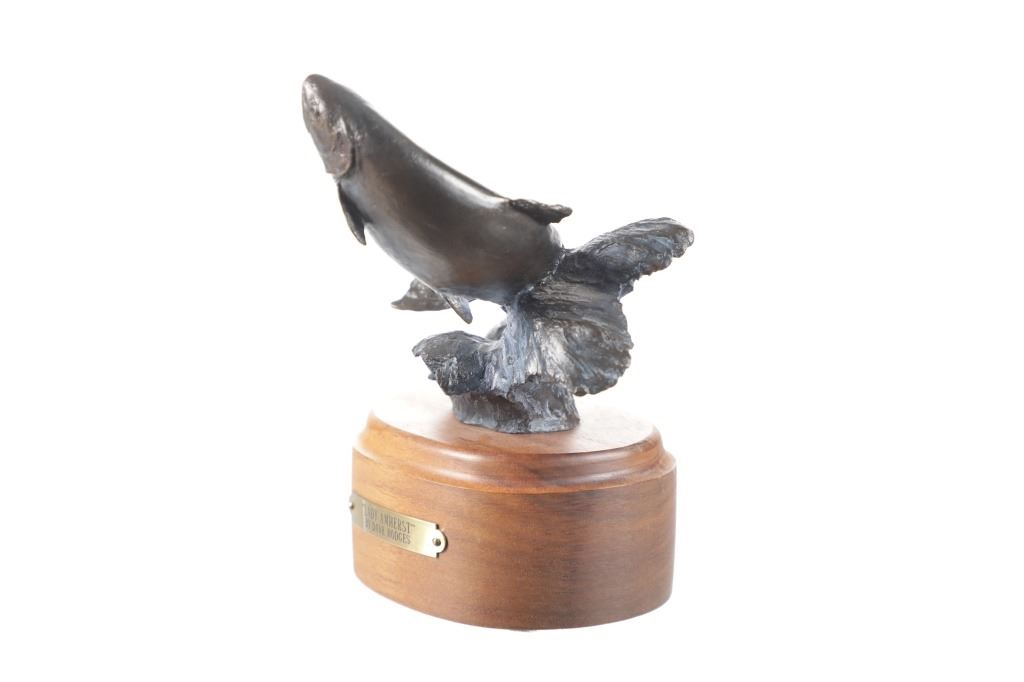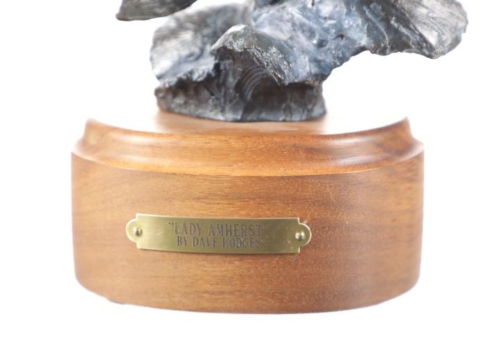 Featured in this lot is this bronze sculpture called "Lady Amherst," by Montana artist Dave Hodges circa 1992. The sculpture features a wonderfully and professionally crafted bronze and hardwood construction taht shows a trout sunfish jumping in the water. The bronze is mounted on a hardwood shield and the bronze and plaque is marked as follows: "Lady Amherst" by Dave Hodges - 47/100 - D Hodges - 1992. Dave Hodges, a Big Timber Montana artist, graduated from MSU in 1979. In 1982, he began his professional career as a bronze sculptor and his work has become highly sought after by collectors. The condition of this bronze sculpture is good with no obvious signs of damage and shows good overall condition. The measurements of this bronze sculpture is 5 7/8" x 4 3/8" x 4 1/2". The collective weight of this bronze sculpture is 2lb 4oz.