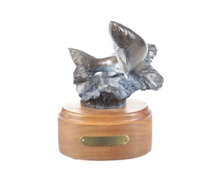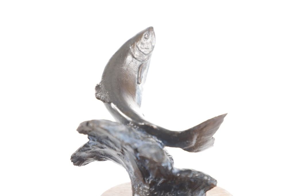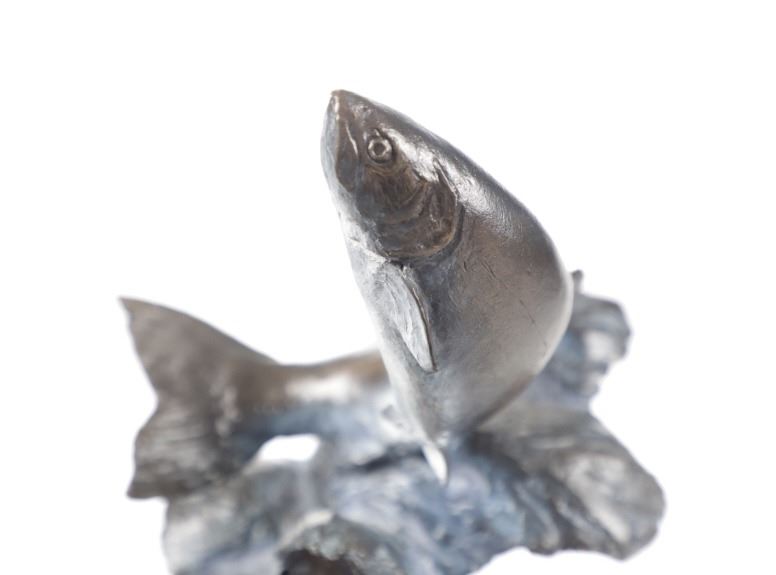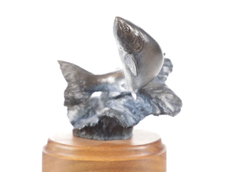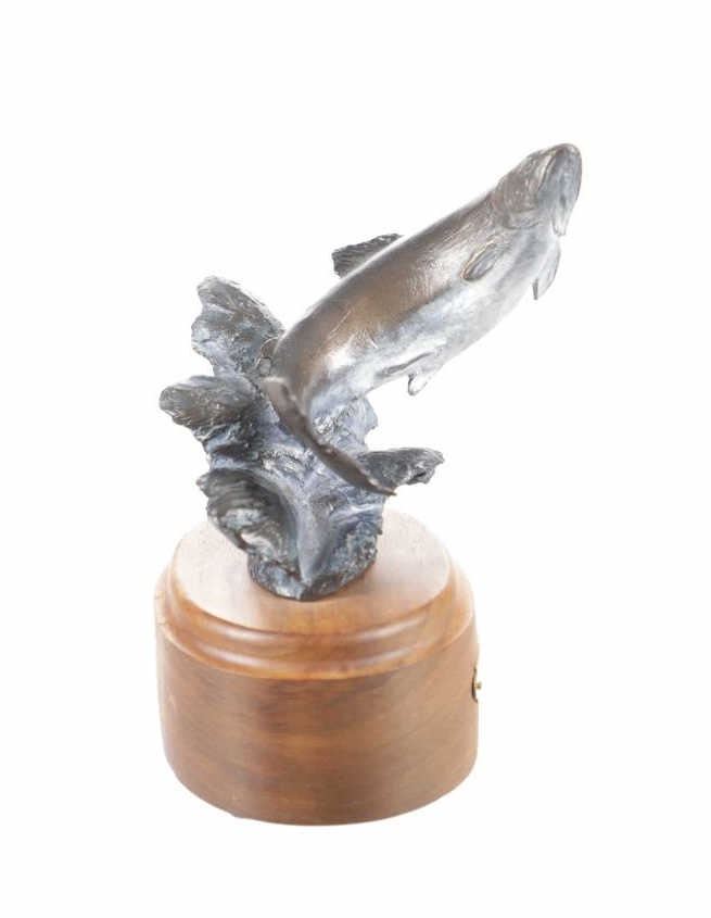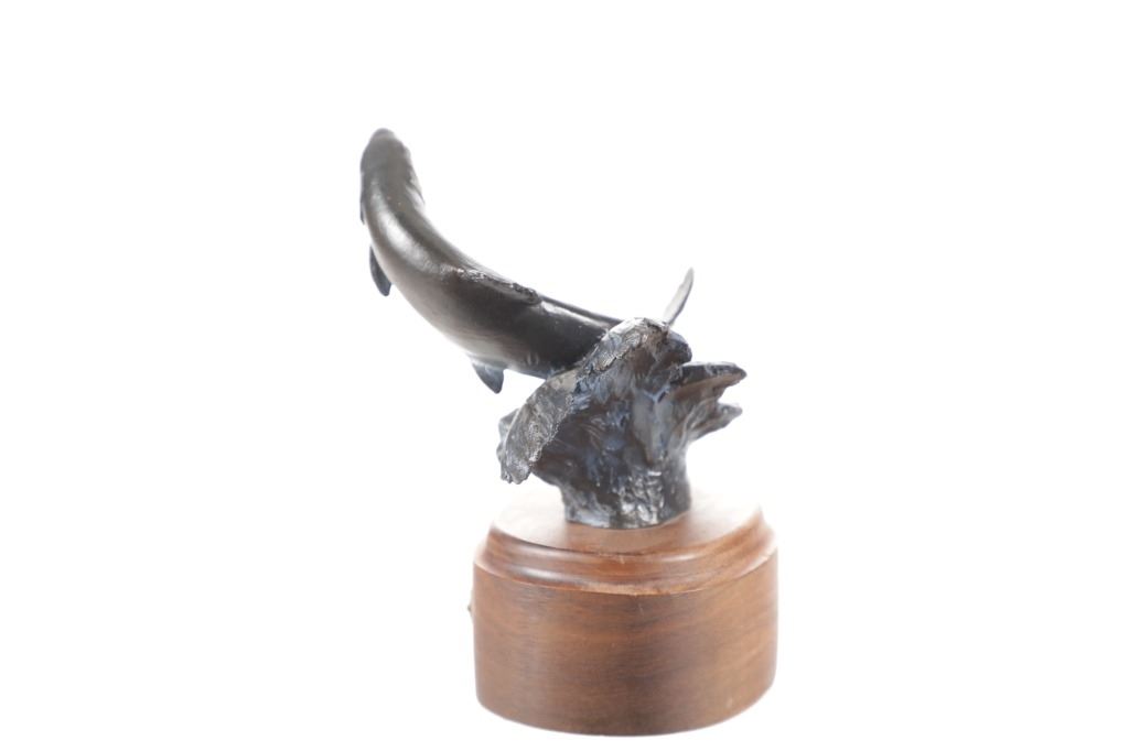 Featured in this lot is this bronze sculpture called "Lady Amherst," by Montana artist Dave Hodges circa 1992. The sculpture features a wonderfully and professionally crafted bronze and hardwood construction taht shows a trout sunfish jumping in the water. The bronze is mounted on a hardwood shield and the bronze and plaque is marked as follows: "Lady Amherst" by Dave Hodges - 47/100 - D Hodges - 1992. Dave Hodges, a Big Timber Montana artist, graduated from MSU in 1979. In 1982, he began his professional career as a bronze sculptor and his work has become highly sought after by collectors. The condition of this bronze sculpture is good with no obvious signs of damage and shows good overall condition. The measurements of this bronze sculpture is 5 7/8" x 4 3/8" x 4 1/2". The collective weight of this bronze sculpture is 2lb 4oz.