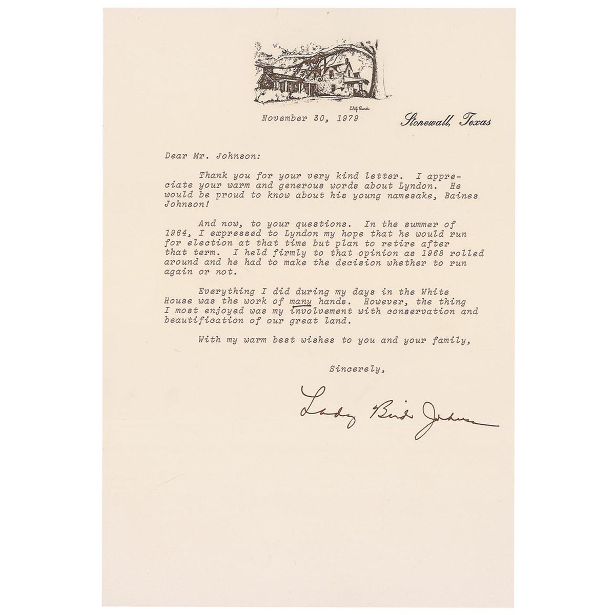 Two items: TLS, signed “Lady Bird Johnson,” one page, 7.25 x 10.5, Stonewall, Texas letterhead, November 30, 1979. In a response to an inquiring admirer, Johnson writes, in full: “Thank you for your very kind letter. I appreciate your warm and generous words about Lyndon. He would be proud to know about his young namesake, Baines Johnson! And now, to your questions. In the summer of 1964, I expressed to Lyndon my hope that he would run for election at that time but plan to retire after that term. I held firmly to that opinion as 1968 rolled around and he had to make the decision whether to run again or not. Everything I did during my days in the White House was the work of many hands. However, the thing I most enjoyed was my involvement with conservation and beautification of our great land”; and a print of Johnson, 5 x 7, signed in black felt tip beneath a printed facsimile Lyndon Johnson signature, “Lady Bird Johnson—thank you for your thoughtfulness.” In fine condition, with one of the two horizontal mailing folds lightly affecting two letters of Lady Bird’s signature.