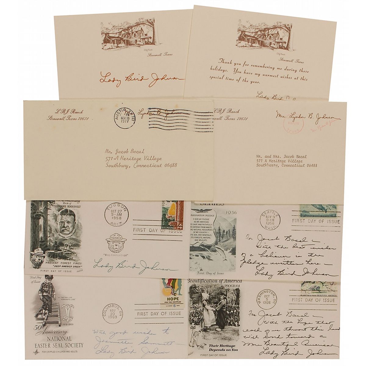 Five items: four FDCs with various cachets, three inscribed and all signed in ink or ballpoint by Johnson; and one 5.75 x 3.75 card bearing an image of the Johnsons’ Stonewall home, signed at the bottom in brown felt tip. In overall fine condition. Accompanied by a White House card bearing a pre-printed signature, an unsigned portrait, and a letter from her secretary.