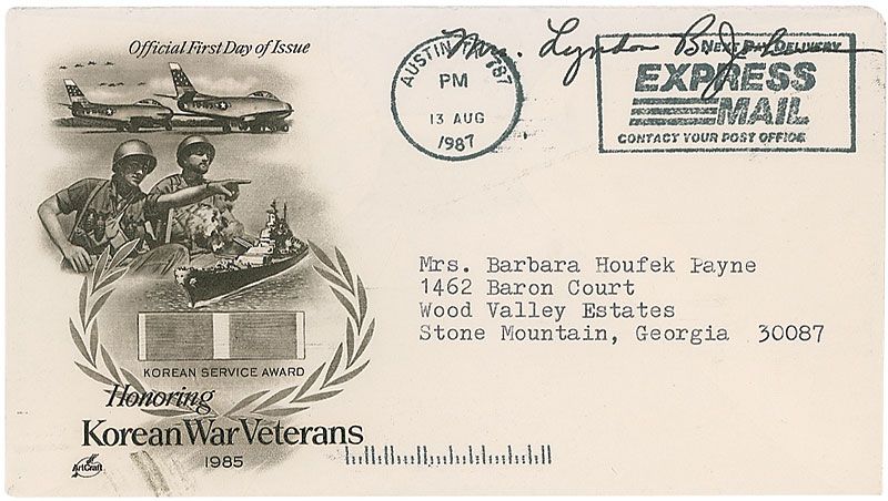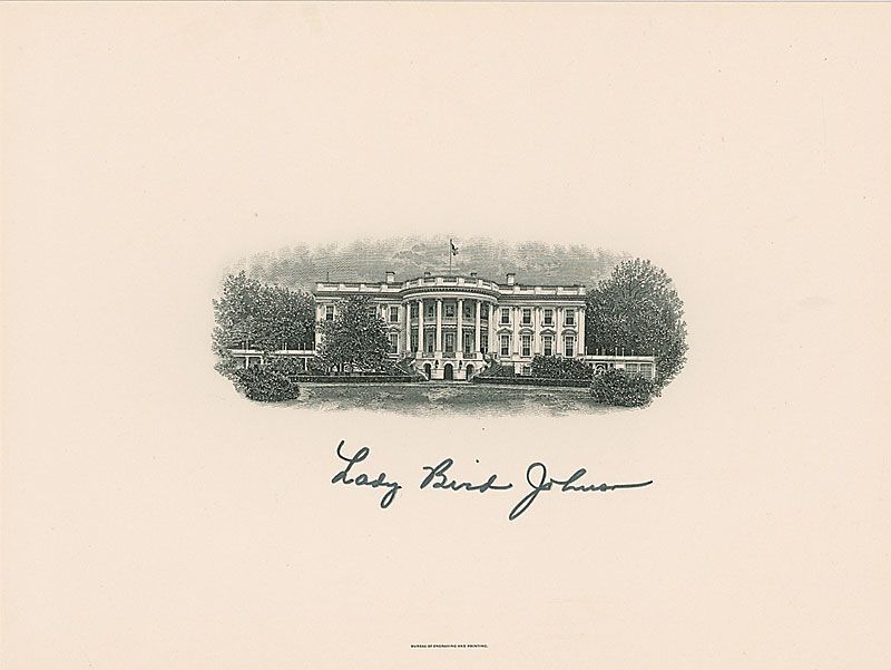 Two items: one engraved portrait of the White House, 8 x 6, by the Bureau of Engraving and Printing, signed below the image in black felt tip; and one commemorative cover with a cachet honoring Korean War veterans, franked in the upper right, “Mrs. Lyndon B. Johnson.” In overall fine condition.