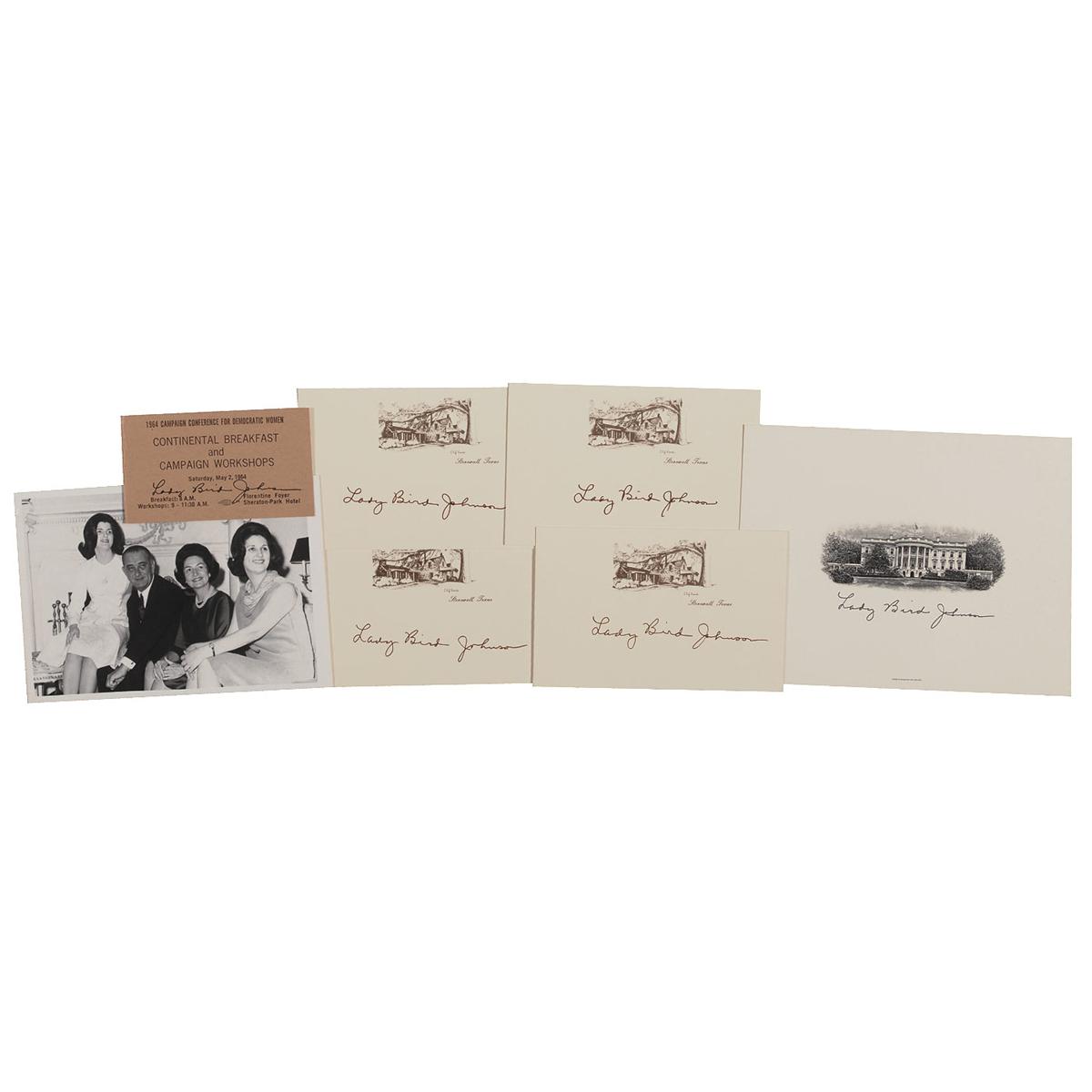 Six signed items: an 8 x 6 engraved portrait of the White House, signed in black ink; four off-white 5.75 x 3.75 LBJ Ranch cards, each signed in brown ink; and a 4.5 x 2.5 ticket to the 1964 Campaign Conference For Democratic Women Continental Breakfast and Campaign Workshops, signed in black ink. In fine overall condition.