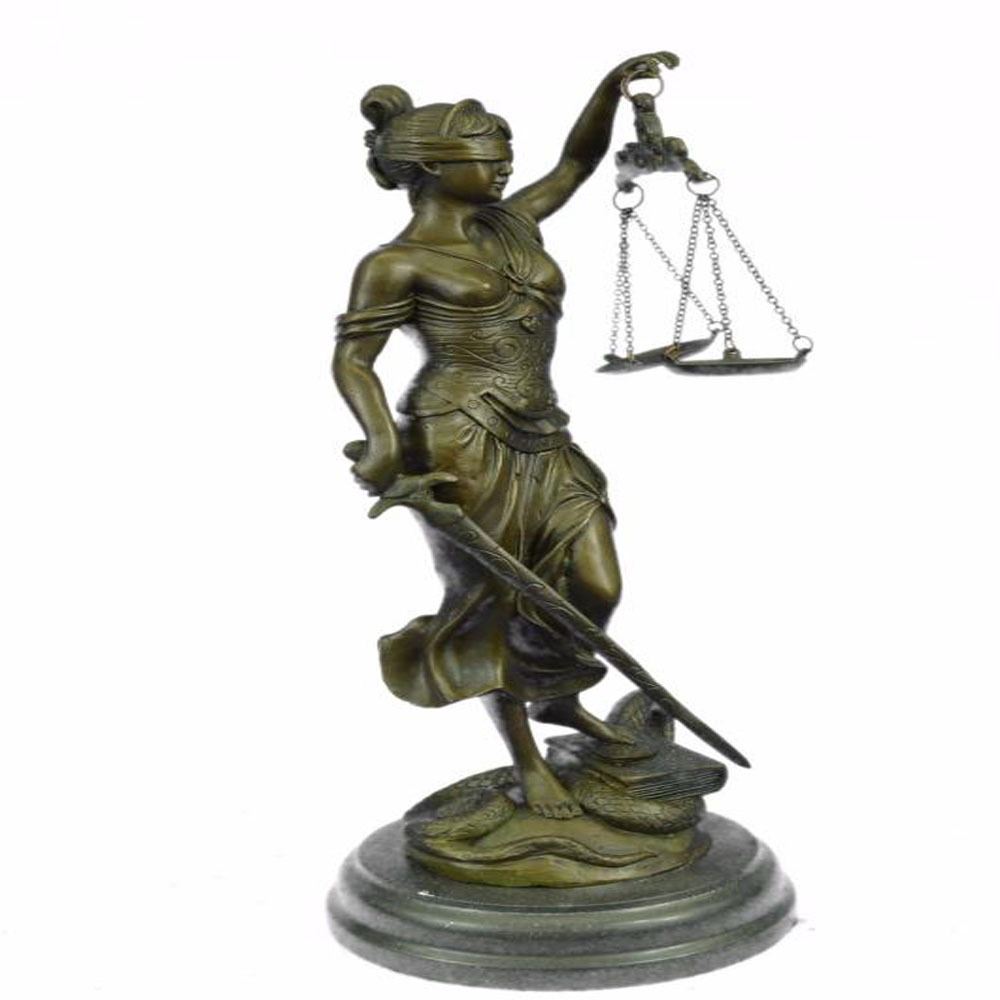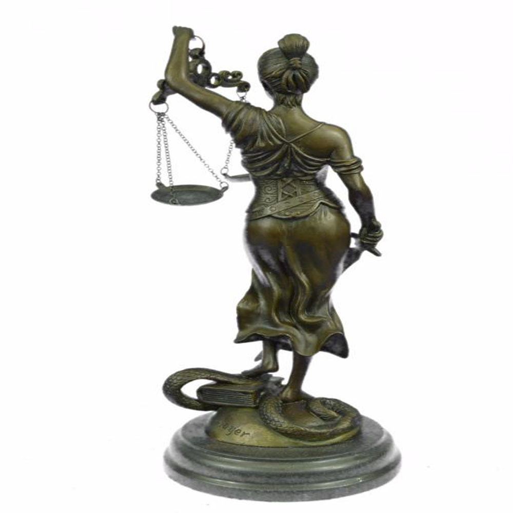 The Bronze Sculpture is of Lady Justice Roman goddess of Justice who is the symbolic personification of the moral force in judicialsystems. As anciently depicted, the blindfolded Lady Justice, is seen balancing the scales of truth and fairness from her left hand, holdinga sword, while stepping on a book and a snake that coils around herfeet. The scales, represent truth and fairness and measures thestrength of a cases support and opposition. The blind fold, represents objectivity, in that justice is or should be meted out objectively without biases. The sword, symbolizes the power of reason and justice, which may be wielded either for or against any party. The book represents history, signifying to stand against wrongdoings or with the good doings of the past. The snake symbolizes hatred hence thefoot that stops it from getting its grip. She was captured using theageold method of lost wax casting and stained with a brown patinafinish. She is mounted upon a marble base. Bronze Dimensions with Marble Base: Height 14 X Width 7 inches. Weight: 9 LBS.
