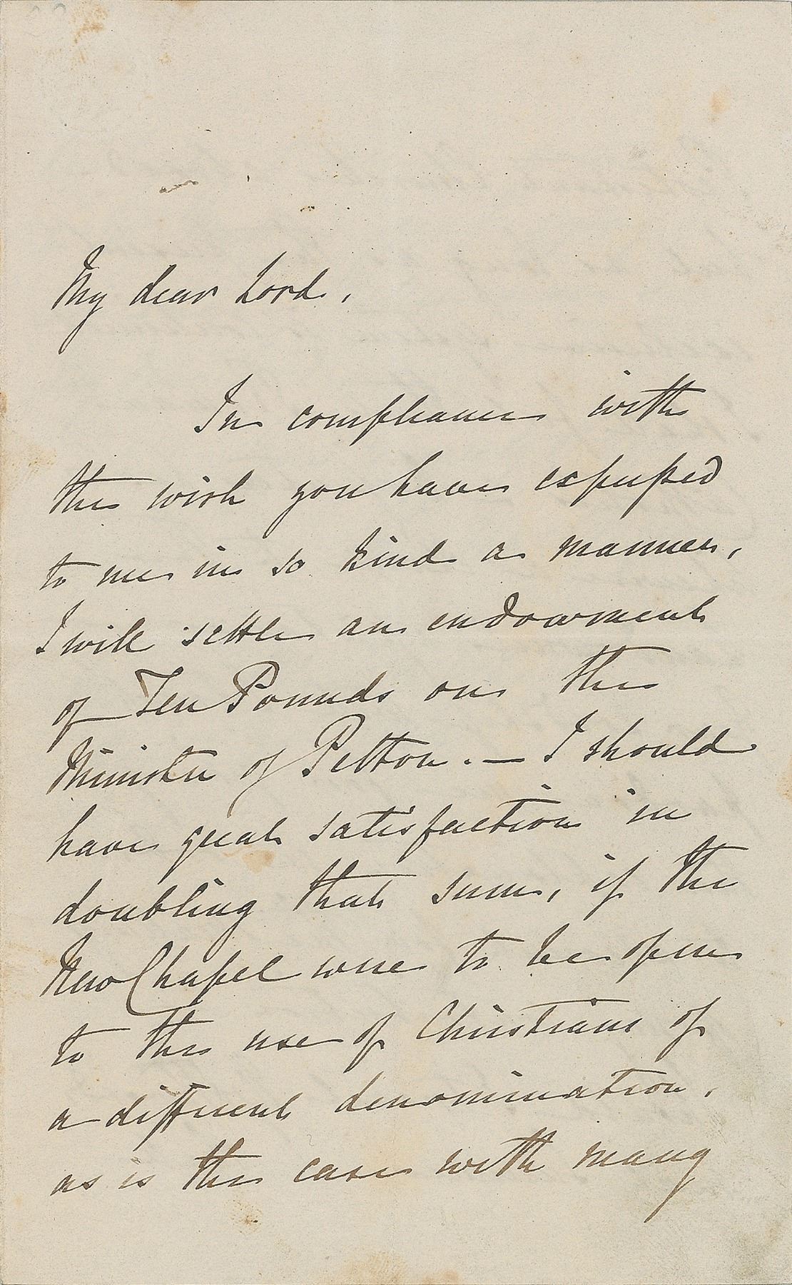 Wife (1792–1860) of poet George Gordon Byron, commonly known as Lord Byron. ALS signed “A. I. Noel Byron,” three pages on two adjoining sheets, 4.5 x 7.25, October 31, 1842. Letter to a Lord, contributing ten pounds toward the construction of a new chapel. In part: "In compliance with the wish you have expressed to me in so kind a manner, I will settle an endowment of Ten Pounds on the Minister of Petton. I should have great satisfaction in doubling that sum, if the New Chapel were open to the use of Christians of a different denomination, as is the case with Protestant Churches abroad—but as long as the present exclusion system is continued I shall feel that Roman Catholics & Dissenters have likewise a claim to the Landowner's assistance. Your Lordship will I trust pardon me for giving this explanation in order to account for the smallness of my contribution. Should I travel Northwards next Summer, I shall be happy to accept yours & Mr. Maltby's gratifying invitation." In fine condition, with light soiling to the first page.