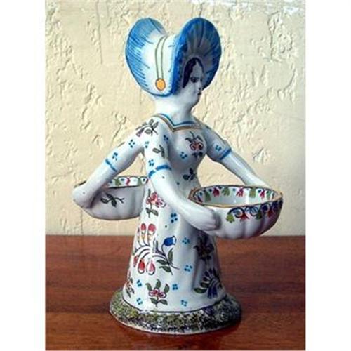 This is a rare and unusual French Faience Lady Double Salt made in the Desvres region of France. The subject matter includes a lady with two faces, bonnets, and sets of arms holding two baskets, with a décor of dots and flowers. The outsides of the baskets are textured in relief; 1792 is on the base of the skirt. The modeling, decorating, and glaze are well done with typical colors of Desvres pottery: creamy white background decorated with bright dark blue, brilliant lemon yellow, iron red, and sage green. The bottom inside is glazed; the foot rim is unglazed. The underside is marked FF in under glaze brown, the mark of FOURMAINTRAUX FRERES, and 1 and 651 for the decorators number and the style. Desvres faience was a famous art pottery technique whereby tin glazes and decorations are applied over modeled terra cotta clay forms, and fired several times in a kiln. Please note this is not Quimper, but Desvres. Though similar, there are different color palettes used and other nuances on the two potteries. Dimensions (in inches): 7.4 Tall X 3.4 Wide X 5.7 Deep. Weight 14.3 Oz. The date is circa 1890. The item is in very good condition other than firing flaws and minor wear; there have been no repairs or restorations. Shipping and Insurance USPS Priority Mail within the U.S. is $17.00. Thanks for bidding!
